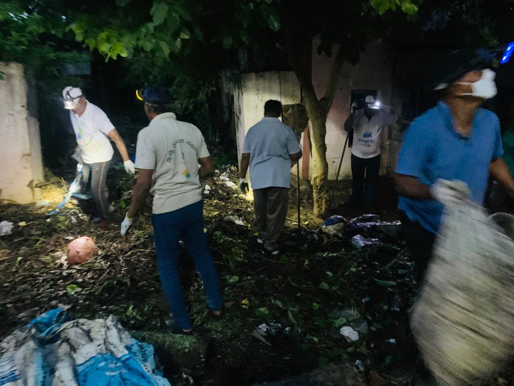 సైజులుగా కోసిన 15-20 కొబ్బరి చెట్ల కాండాలూ, ప్లాస్టిక్ గాజు సీసాలూ, లోపలే ఛండాలమున్నదో తెలియని గోనె సంచులూ, మూటలూ..... ఇంకా ఏ పెన్నిధులున్నవో వంగి చూడలేదు గాని, స్వచ్ఛ కార్యకర్తలందులో కాలు పెట్టగానే గుప్పుమని దుర్గంధాలు! - రోడ్డున పోయే వాళ్లక్కూడా! కార్యకర్తలకైతే గంటన్నర పాటు - ఆ కంపే ఇంపు గాను, చెమటకు తడిసిన బట్టల మీద మరకలే మహా సొంపుగాను మారిపోయినవి!