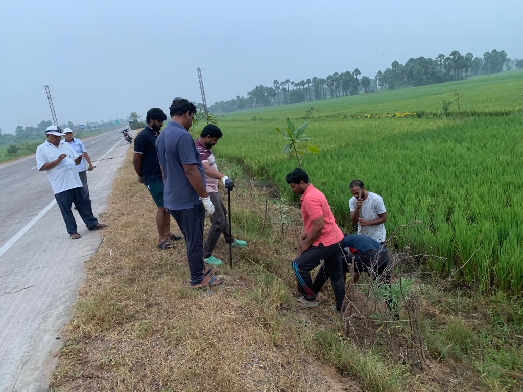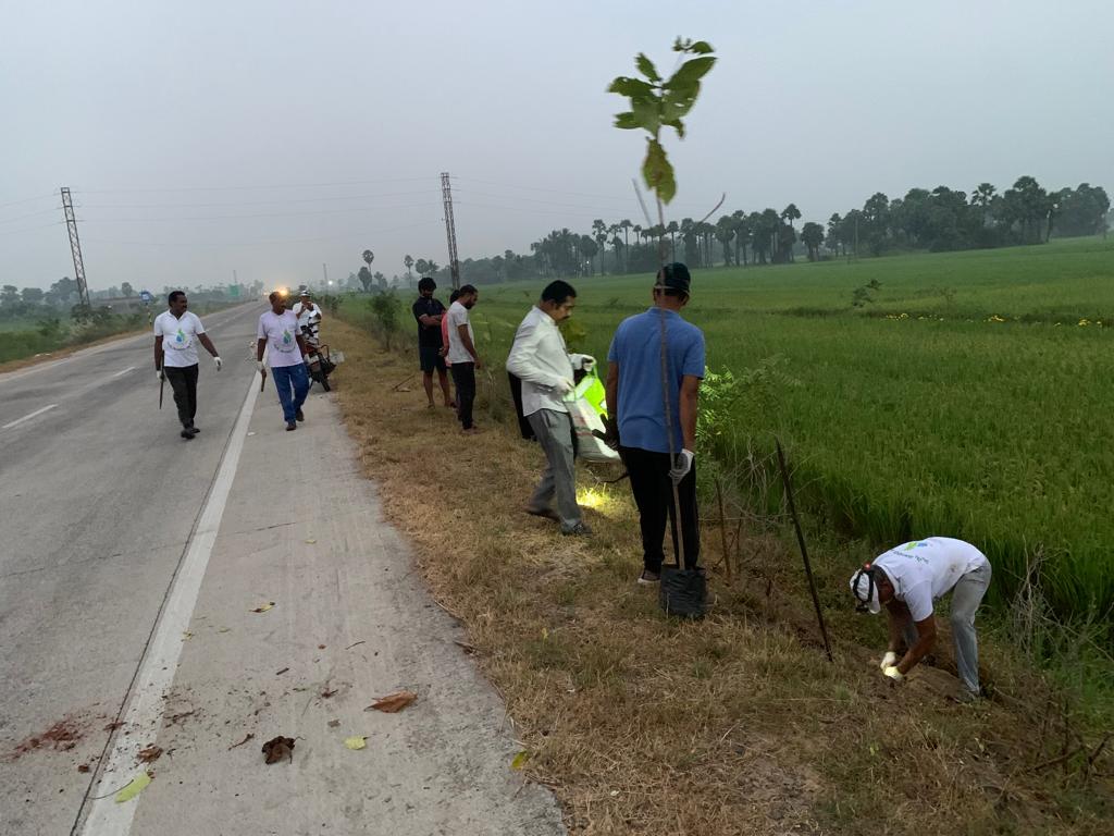 నిన్నటి బెజవాడ రోడ్డు పారిశుద్ధ్యం అర్ధాంతరంగా వదిలేసి, ఈ ఉపదారికి వాలంటీర్లు రావడానికి కారణం - ఇక్కడ బాటకు దక్షిణంగా 75 మొక్కలు నాటాలనే. ఎందుకో గాని 63 మొక్కలే నాటారని తెలిసింది!