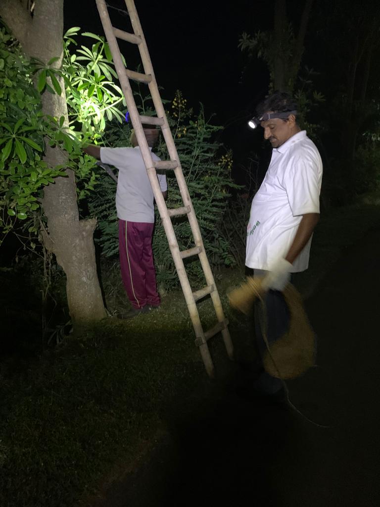 అసలింతకీ “వేకువ చీకట్లో మురుగు నీళ్ల ఒడ్డున చెట్టెక్కే అగత్యమేమున్నది?” అంటే – అంత పెద్ద చెట్ల మీదికి ప్రాకించిన పూల తీగలు కొన్ని పట్టు తప్పి క్రిందకు వ్రేలాడుతున్నవట! నిచ్చెన్ల మీదుగా 4 చెట్లపై కొమ్మలకెక్కి, తీగల్ని బాగా అమర్చడమే నేటి ముఖ్య కార్యక్రమం!