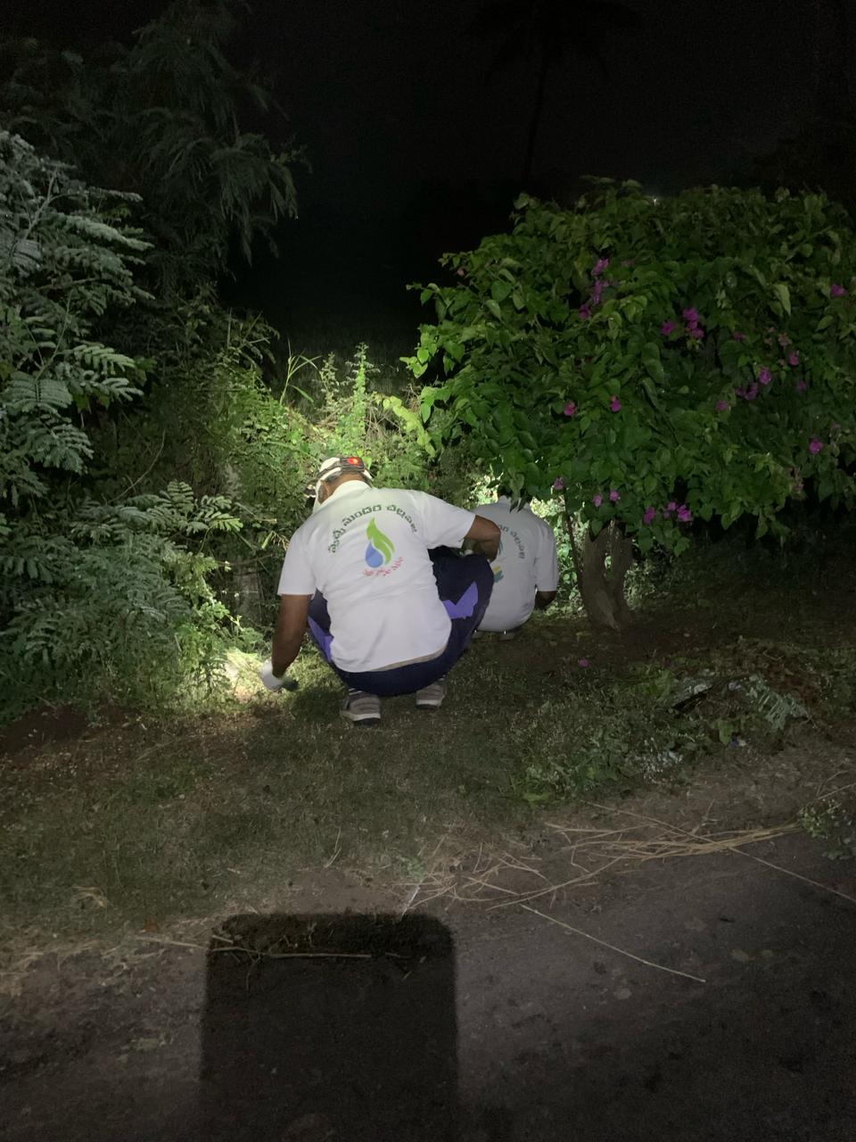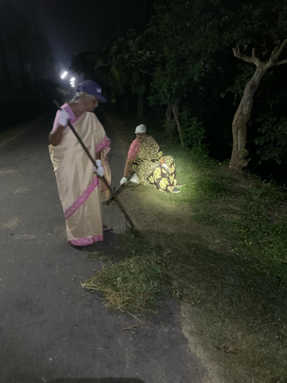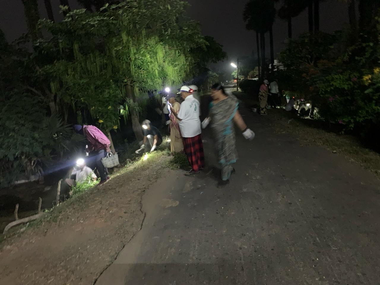 4) ముగ్గురు కార్యకర్తలు సన్ ఫ్లవర్ రోడ్డు ప్రక్కన మురుగు కంపు భరిస్తూ తదేకంగా, మమేకంగా వ్యర్ధాల్ని చెక్కి, కోసి, సేకరిస్తున్నదీ