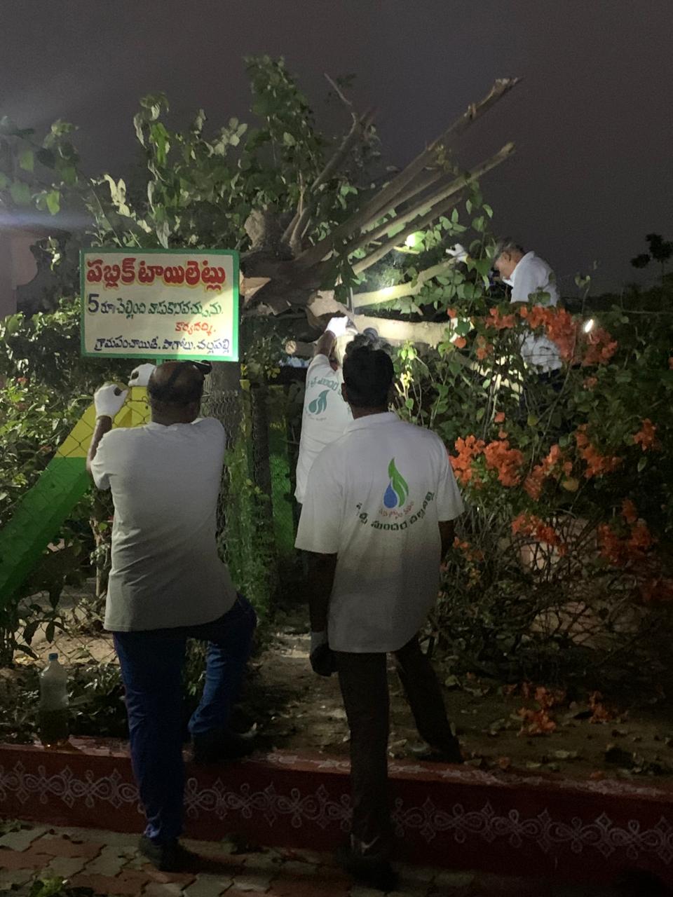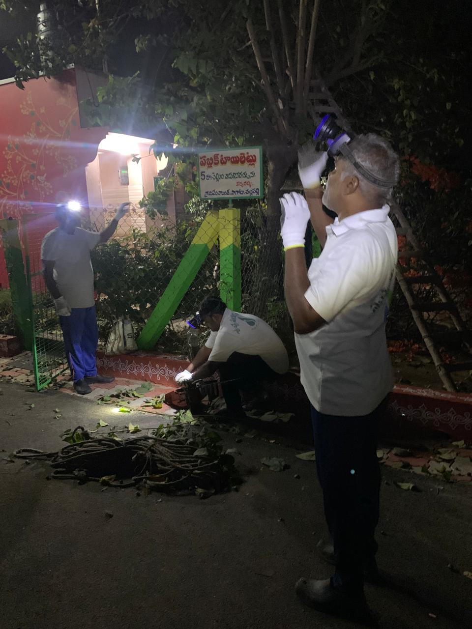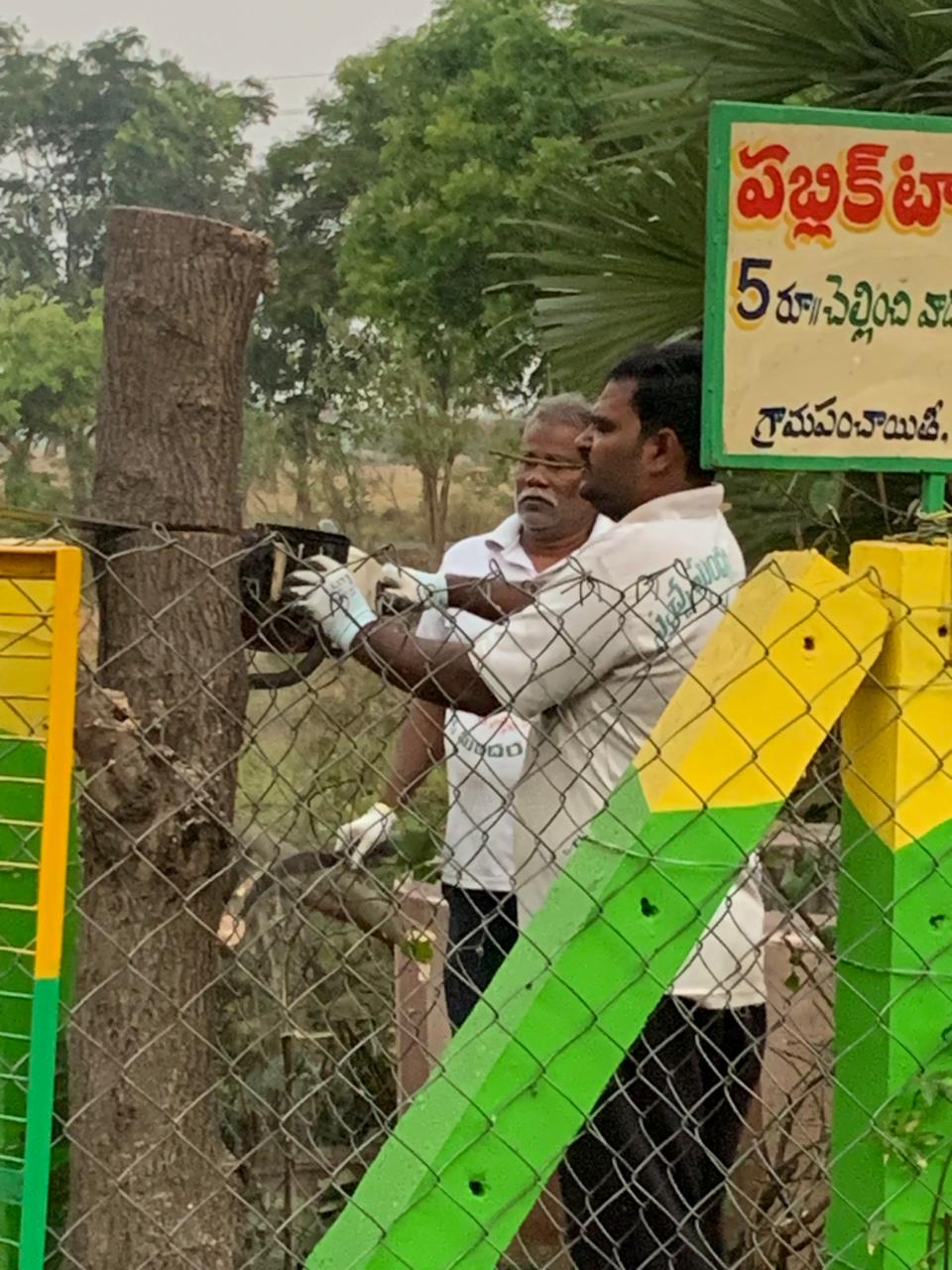 అక్కడ 20 అడుగుల బారు పెరిగి, విద్యుత్ తీగల్తో దూరిన కొమ్మల్తో కోనోకార్పస్ చెట్టూ, వేపచెట్టూ తొలగించడమే నేటి కారక్రమం.