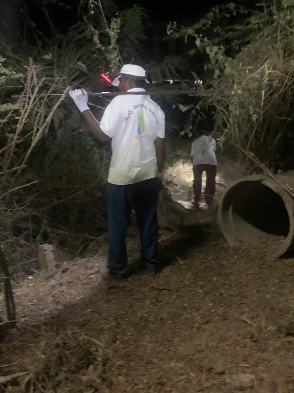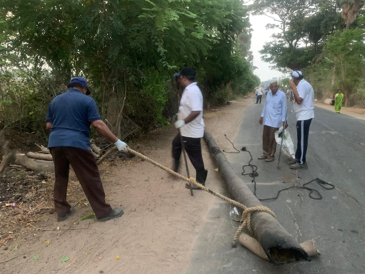 - ఏ బాధ్యతారహితులో నరికి డ్రైన్లో పడేసిన 5 నిలువుల తాడి చెట్లును ముగ్గురు కార్యకర్తలు పైకి లాగి, రోడ్డు వార చెట్ల కానించి, అందంగా సర్దడం,