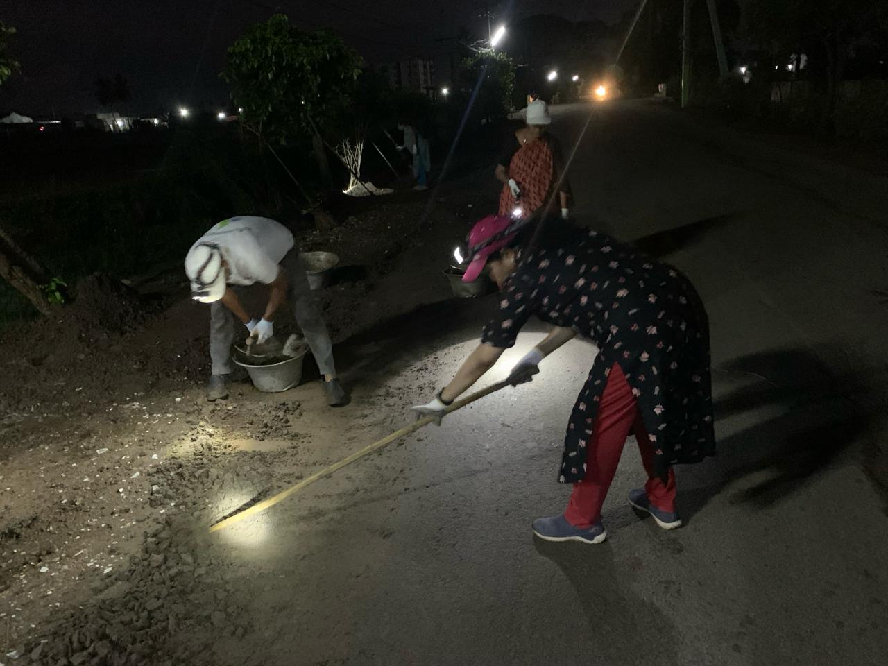 మహిళలెక్కువగా ఉన్న 2 వ కార్యకర్తల గుంపు మళ్లీ గాంధీ స్మృతి వనం ఎదుటి వీధి భాగాన్ని పట్టుకొన్నది. వానలకి వీధి మార్జిన్ల మట్టి రోడ్డెక్కి, నదిలో ఉండాల్సిన ఇసుక దాంతో కలిసి, రోడ్డును మూసేస్తుంటే, తక్కిన గ్రామస్తుల్లా చూసి, సహించలేని బలహీనులు కదా – ఆ 60-70 గజాల బారునా – ముఖ్యంగా సిమెంటు గోడౌను వద్ద ఈ 13 మంది కష్టం చూసే తీరాలి! పారలతో చెక్కిన, గునపాలతో పొడిచిన ఫలితంగా ఎవరి గూళ్ళు పట్టుకుపోయాయో రేపు తెలియవచ్చు!