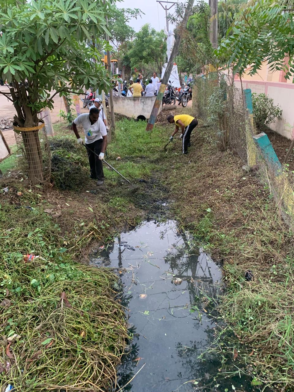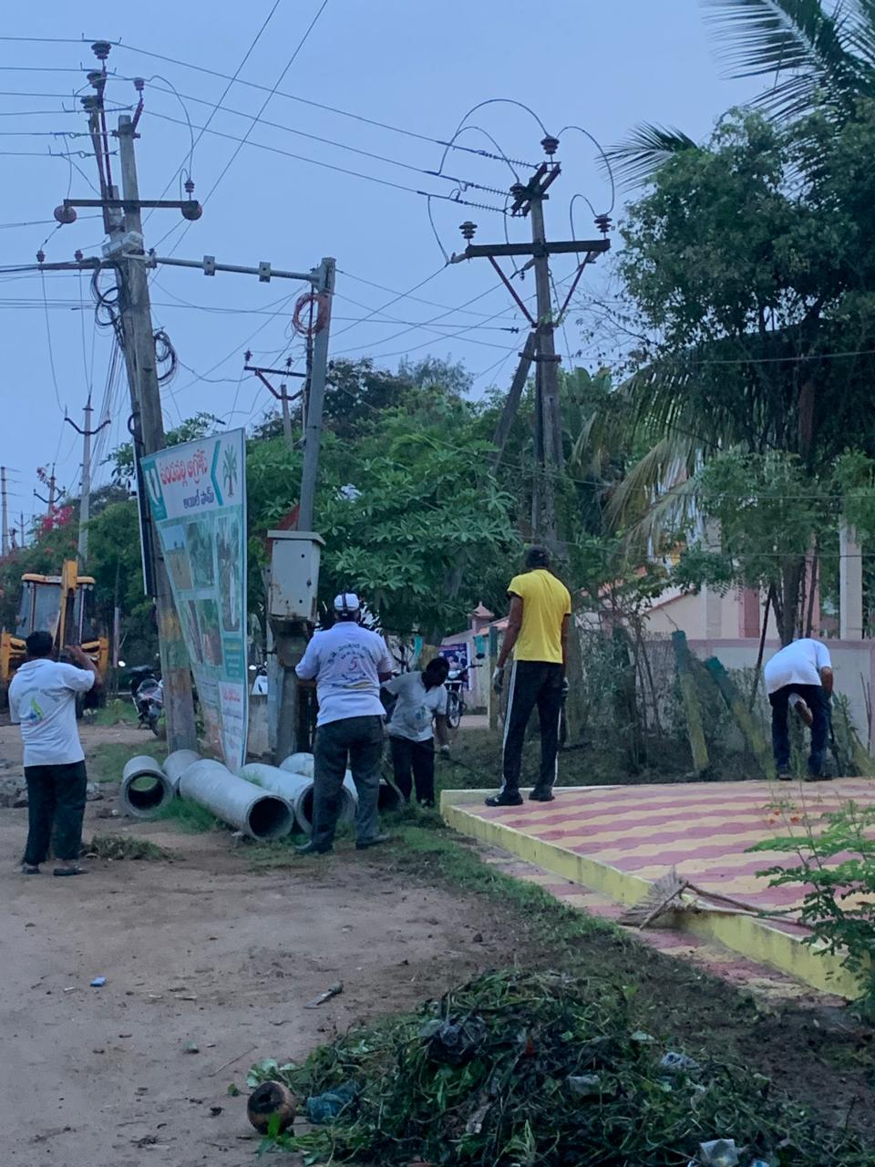 నిన్నటిలా కాక - ప్రకృతి ఈ వేకువ శ్రమదాతలకు సహకరించింది. కాకపోతే ఉక్కపోత మాత్రం తప్పలేదు! పనిచేయకుండా అక్కడ టీ దుకాణం దగ్గర వేడి టీ తాగుతూ బాతాఖానీ వేస్తున్న ఇద్దరికే చెమటలు కారితే - నిచ్చెన్లెక్కి కొమ్మల్నరికే- చీపుళ్లతో వీధుల్ని తుడిచే, పారల్తో రోడ్డు మార్జిన్లను చెక్కి డిప్పలకెత్తి ట్రాక్టర్ లో తరలించి వీధి గుంటల్ని పూడ్చే, NTR విగ్రహం దగ్గర దంతెల్తో డ్రైన్ తుక్కును లాగే కార్యకర్తల సంగతి చెప్పేదేముంది?
