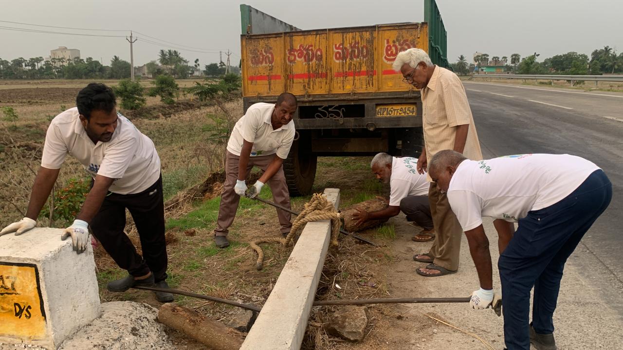 జాతీయ రహదారి ప్రక్కన అనాథగా పడున్న అంతే భారీ స్తంభాన్ని 5 గురు కార్యకర్తలు బలాత్కరించి, గంగులవారిపాలెం వీధిలోకి చేర్చి, అమర్చడాన్నీ –