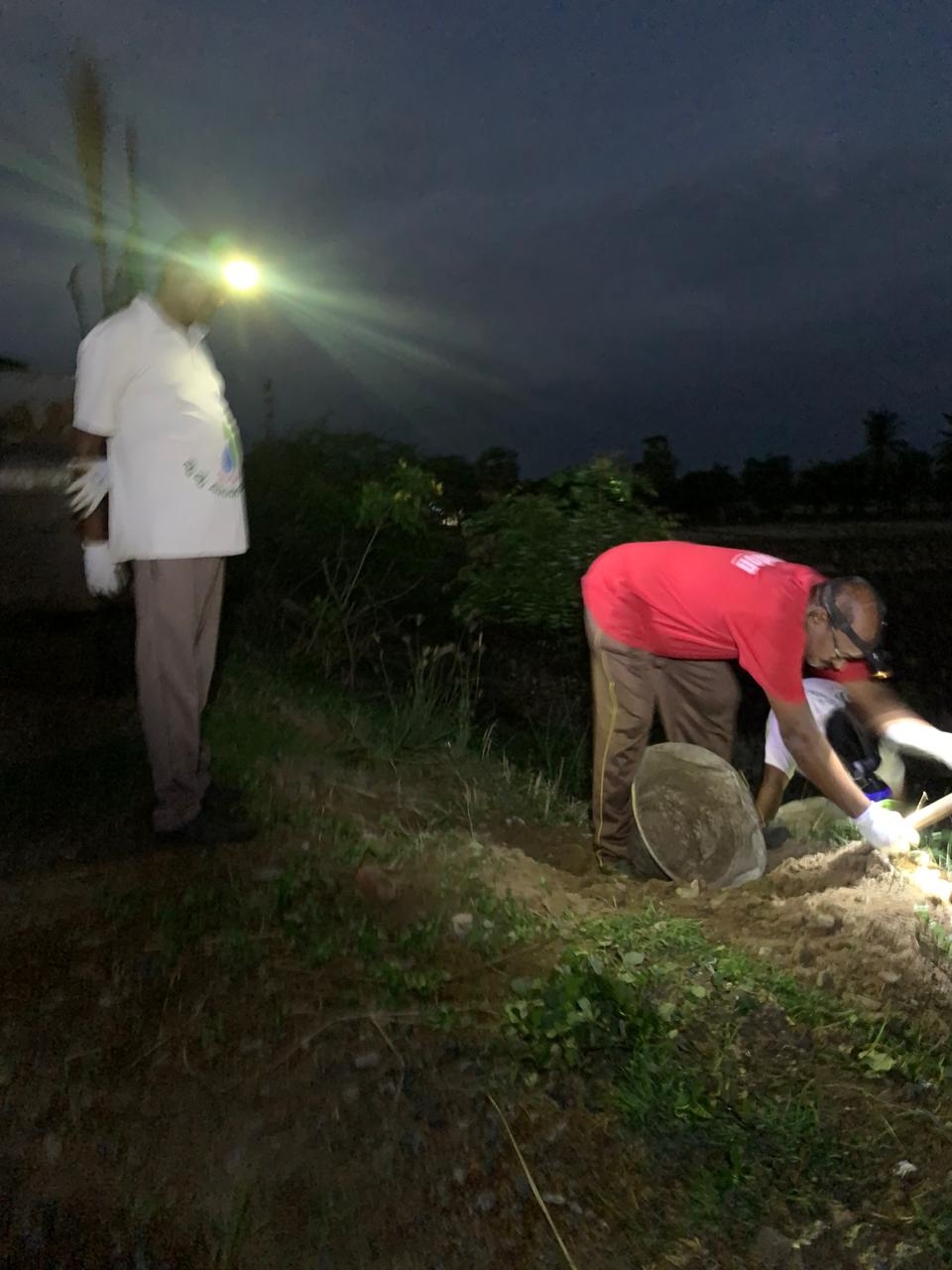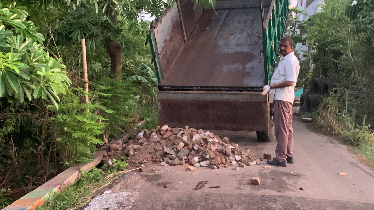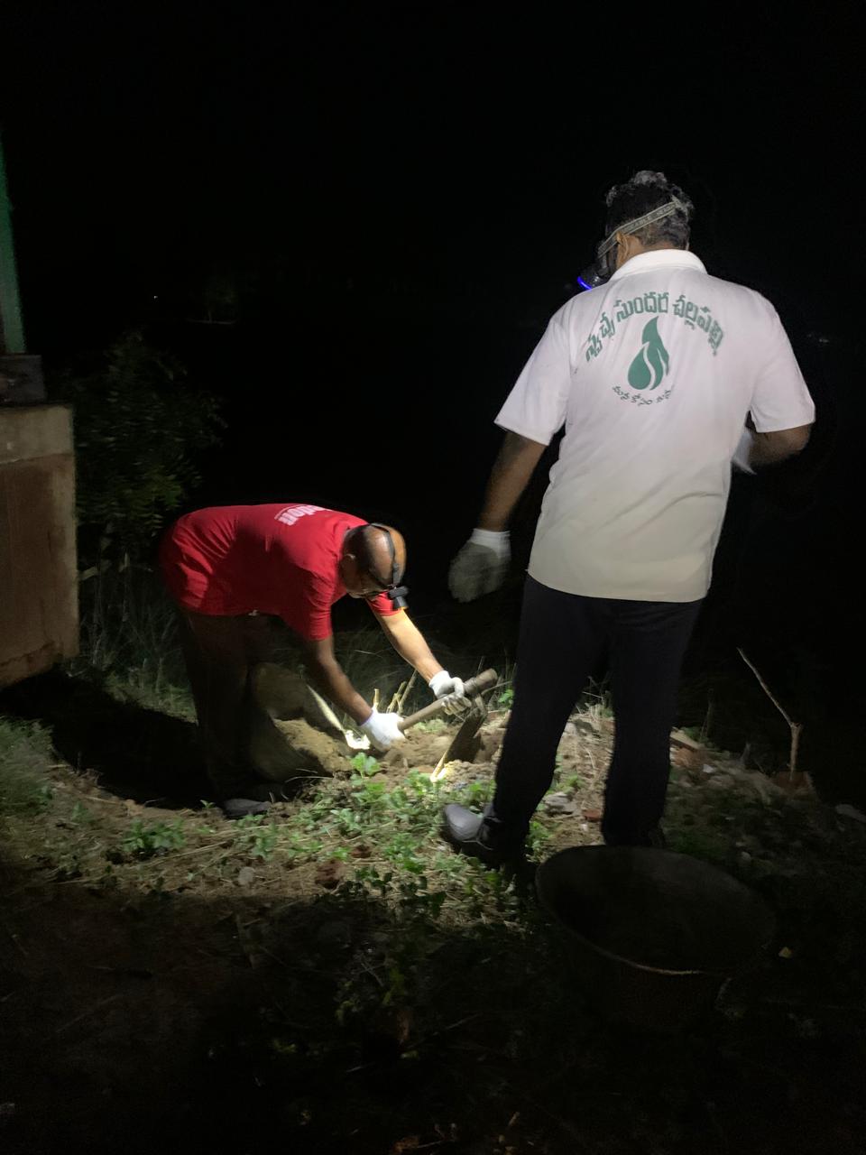వాట్సప్ పాటోలోనే జరిగిన పని వివరాలున్నవి చూడండి - ఒక వీరుడు గడ్డ పలుగుతో త్రవ్వడమూ, ఇంకొకాయన పారతో డిప్పల్నింపడమూ, మరొక శూరుడు డిప్పలు మోసి - ట్రక్కు నింపడమూ! (మరి – కార్యకర్తల బట్టలు చెమటతో ఆ రద్దు ధూళి కలిసి, పేస్టుగా మారకేం చేస్తుంది?)