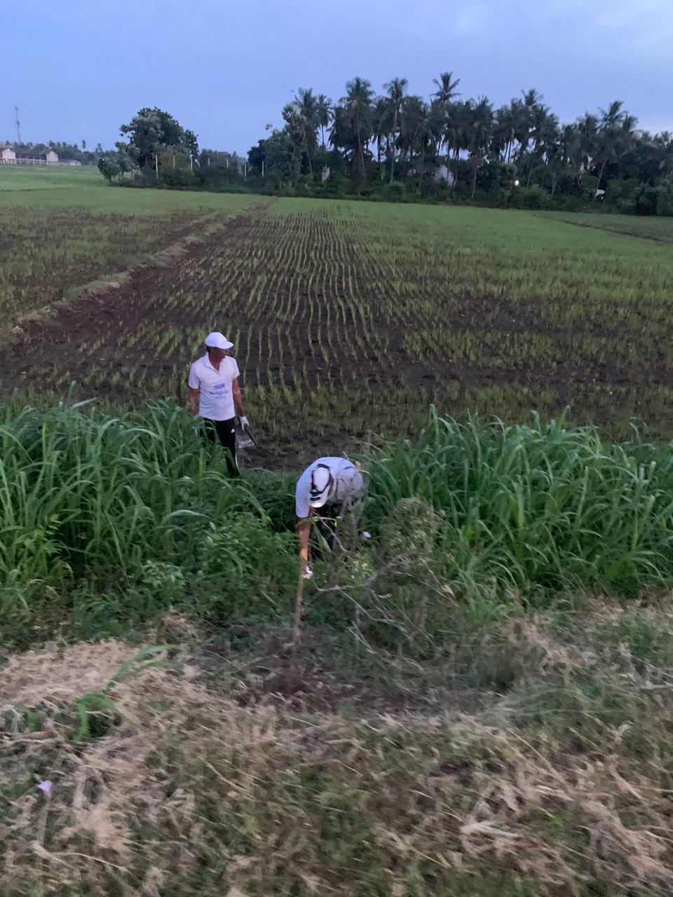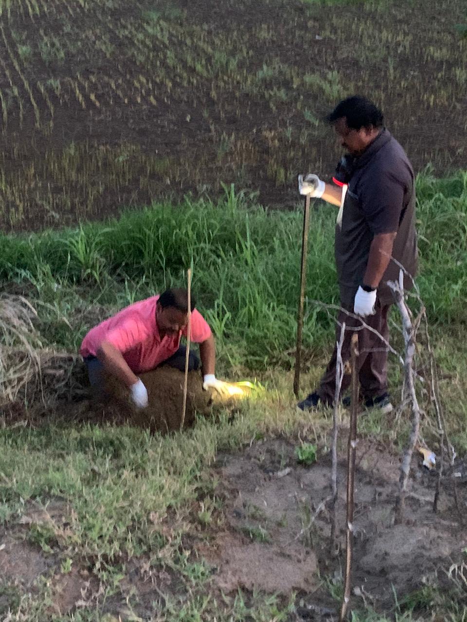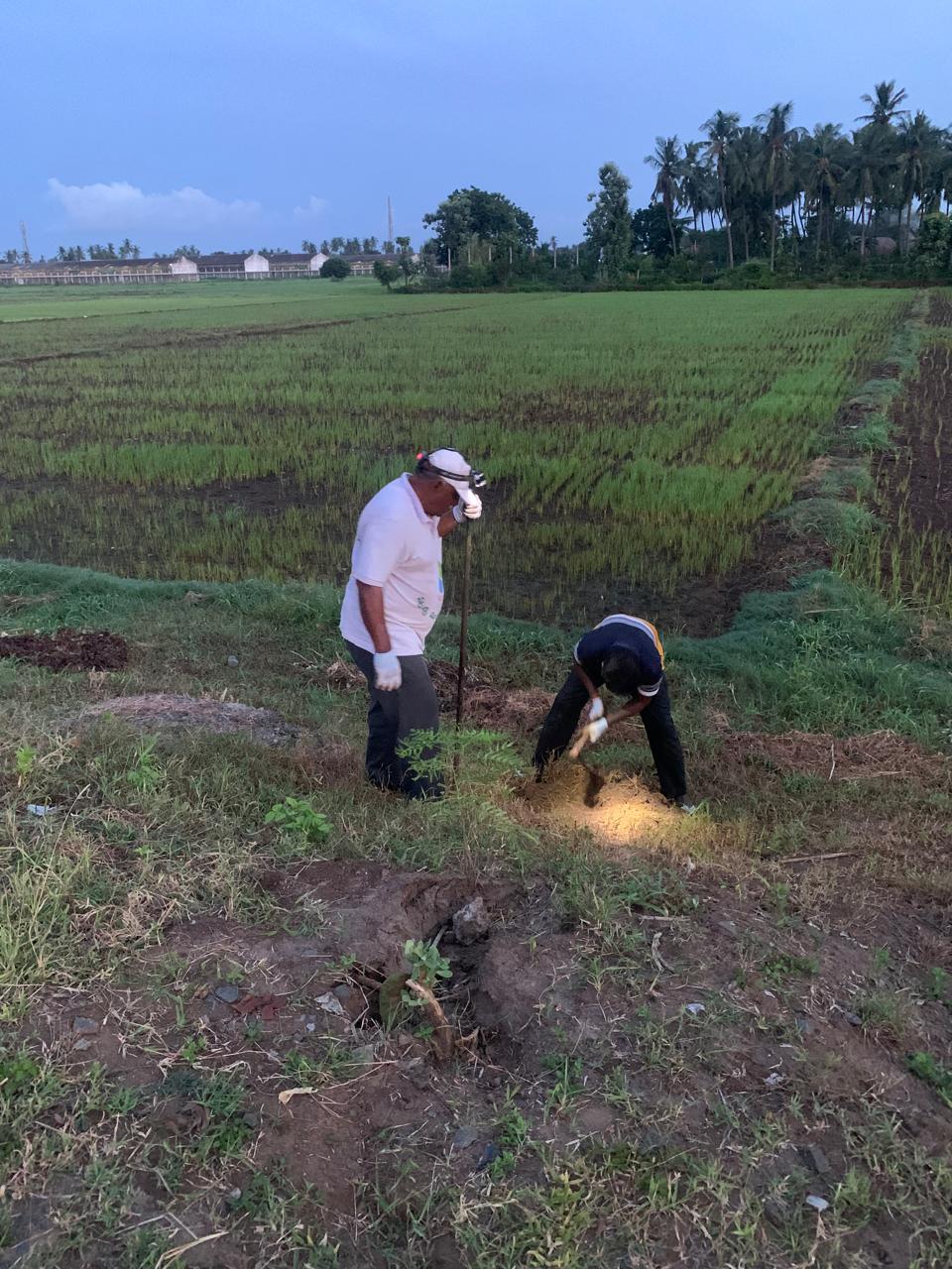 2) ఆ త్రవ్విన లోతైన పాదుల్లోని మట్టిని తీసేందుకు బోర్లా పడుకొని ఒకాయన మెలికలు తిరిగే -