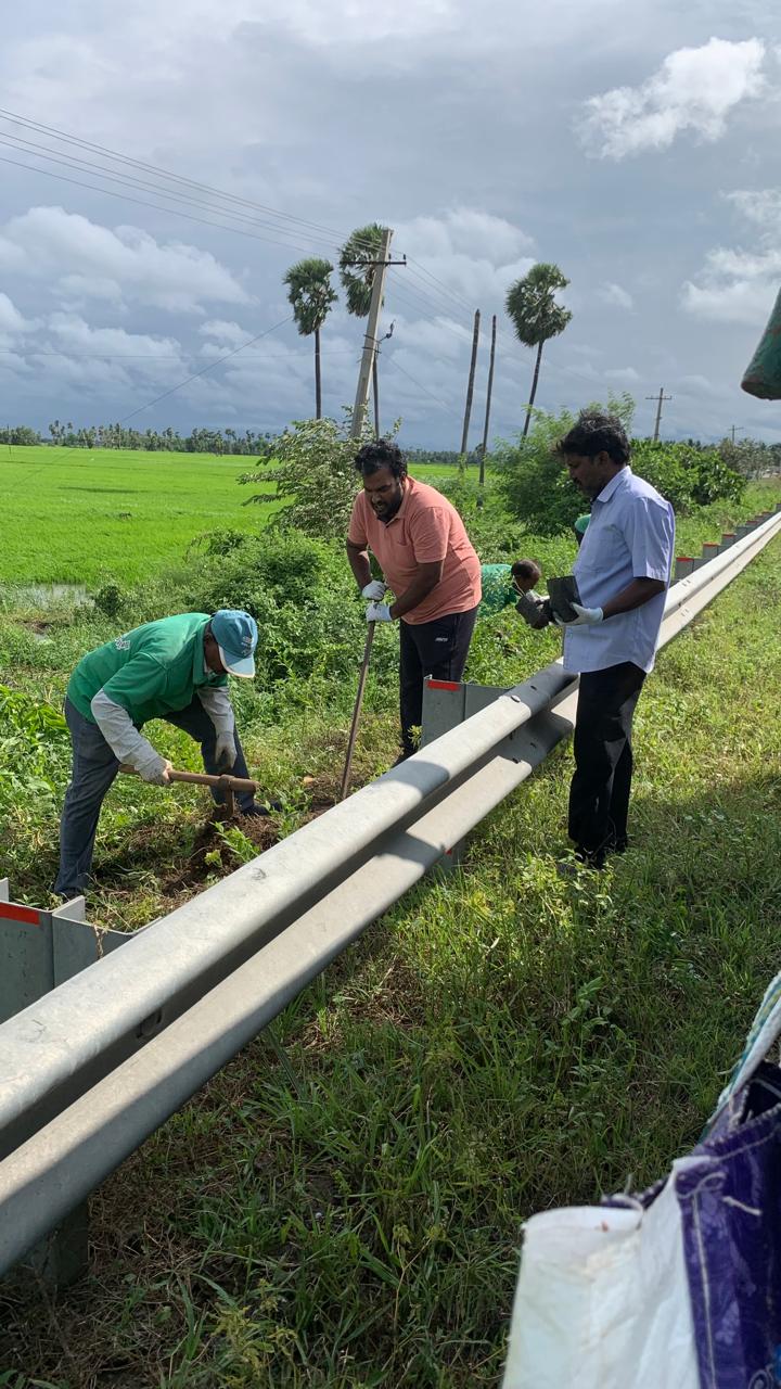 ఆ ఫోను సందేశాలు గొలుసు కట్టులాగా తక్కిన కార్యకర్తలకూ అంది, ముప్పావు గంటలోనే పాతిక ముప్పై మంది చేరుకోవడమూ, అందిన కాడికి తలా ఒకపారో – గునపమో – నక్కో పుచ్చుకొని పాదులు త్రవ్వే వాళ్లు త్రవ్వి, మొక్కలు నాటే వాళ్లు నాటి, కొందరు సందర్శకులూ, కప్తానుపాలెం నుండి ఔత్సాహికులూ పాల్గొని, 170 నుండి 175 గద్ద గోరు పూల మొక్కలు పదేసి అడుగుల దూరంలో పెట్టడం పూర్తయింది!