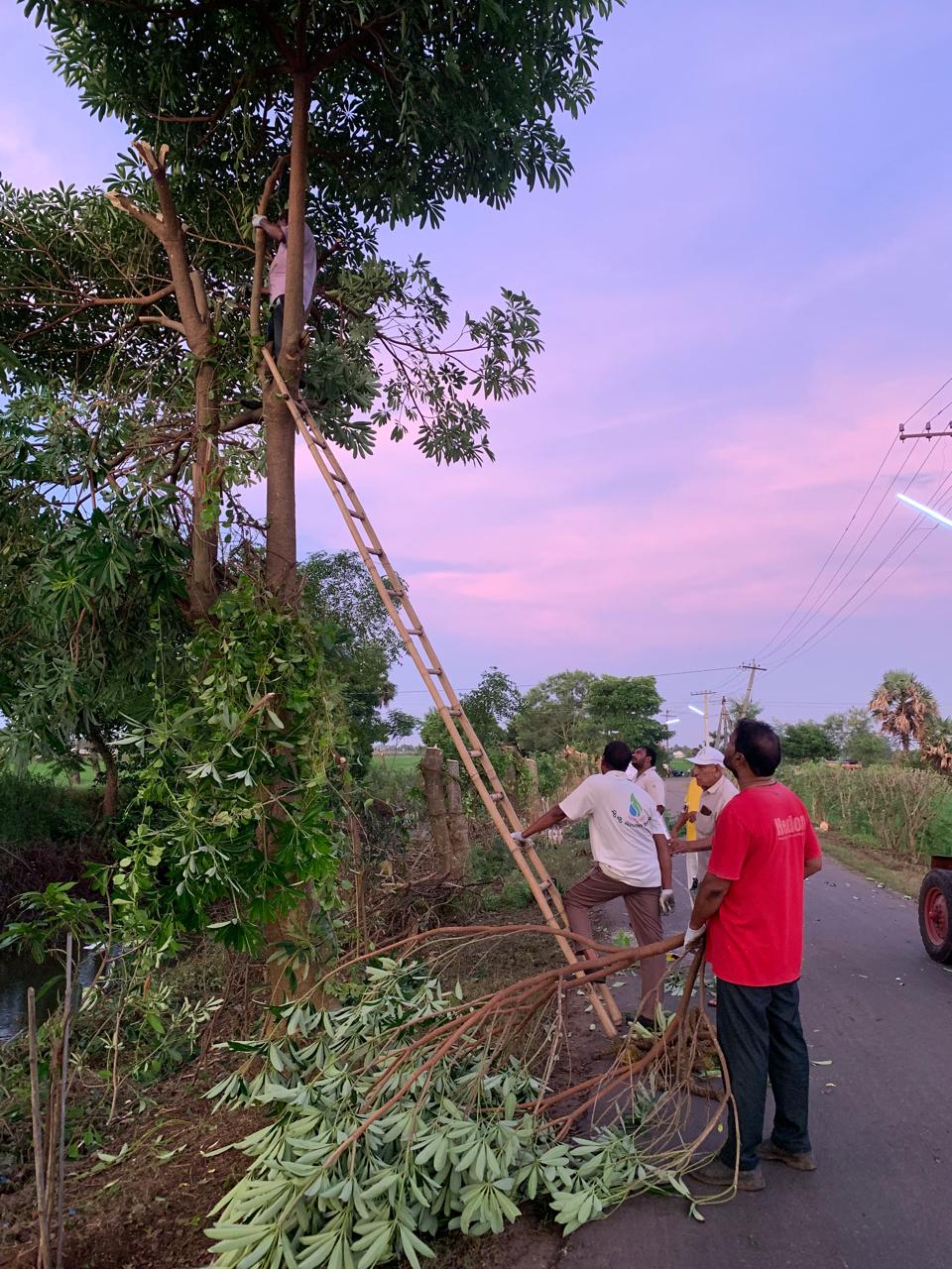 ఏడెనిమిదేళ్లనాడు తామే నాటి, పాదులు త్రవ్వి, కంపకట్టి, నీరు పోసి గారాంగా పెంచిన సదరు ఏడాకుల వృక్షాలను మొహమాటం లేకుండా - ఖండ ఖండాలుగా శిక్షించిన ఒకానొక షష్ట్యబ్ద విశ్రాంత ఉద్యోగి! అతడిని ప్రోత్సహించి, చెట్టెక్కించిన 3 గ్గురు కార్యకర్తలూ!