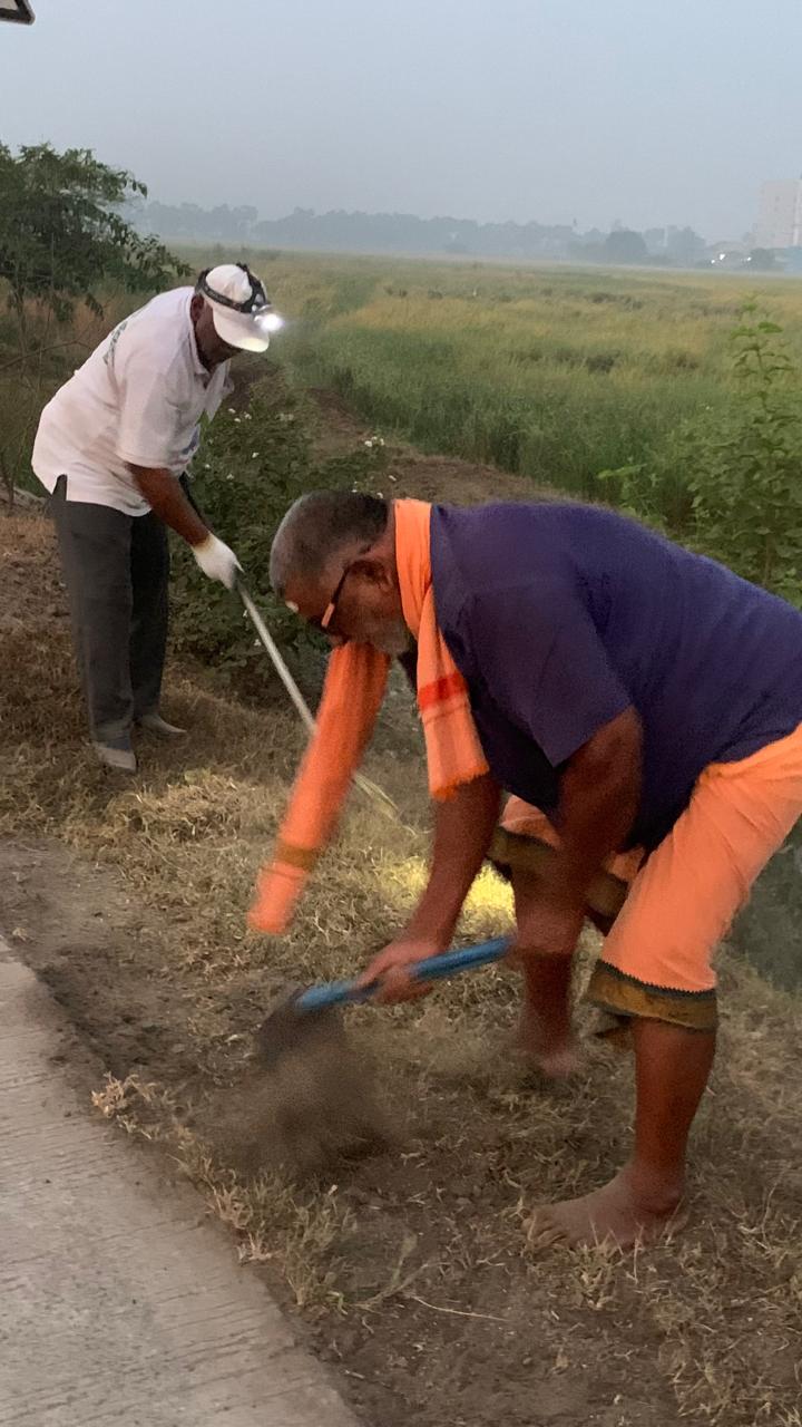 II. శివరామపురం రోడ్డులో హైవేకి ఉత్తరాన - 50 గజాల రోడ్డు మార్లిన్ల వద్ద ఇద్దరు భారీ విశ్రాంత వృద్ధ కార్యకర్తలూ, వాళ్ళిద్దరి వల్ల బక్కగా కన్పిస్తున్న మరొక పెన్షనరూ, తదుపరి మరో 4 గురూ సాధించిన శుభ్రత + భద్రత! 6.08 తర్వాత పని అపి, నడుములెత్తి, గంటన్నర పాటు తాము సాధించిన దానికి సంతృప్తినీ ఒకింత గర్వాన్నీ పొందారంటే - తప్పేముంది?