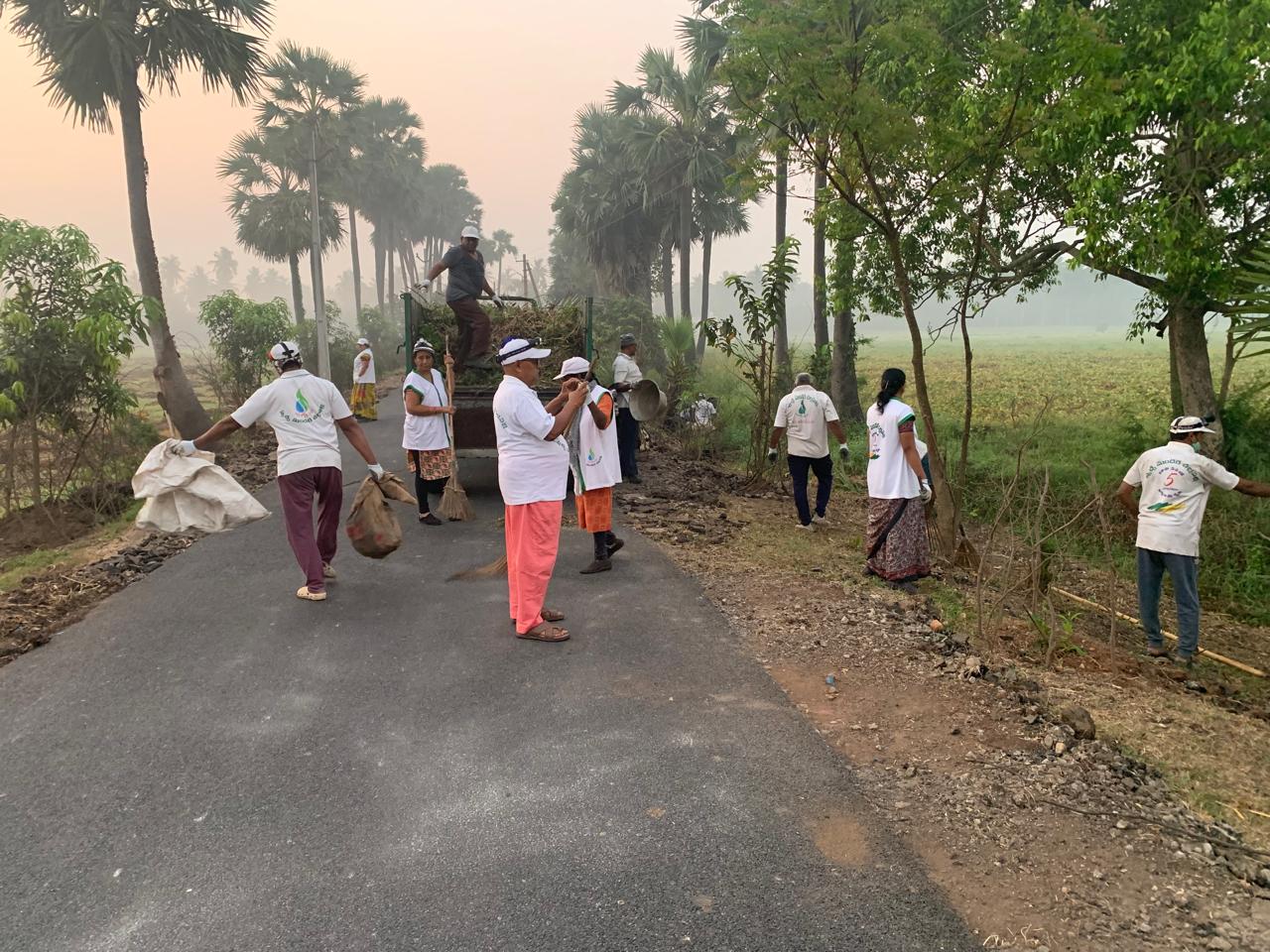 వీధి మొత్తాన్ని ఐదారుగురు మహిళలు ఊడ్చేశారు. గంటన్నర తర్వాతనే ప్లాస్టిక్ వ్యర్థాల్ని, గాజు పెంకుల్ని, ప్రాత చెప్పుల్ని ఏరేవాళ్లు 3 గోనె సంచులు నింపి, సంతృప్తి చెందారు!