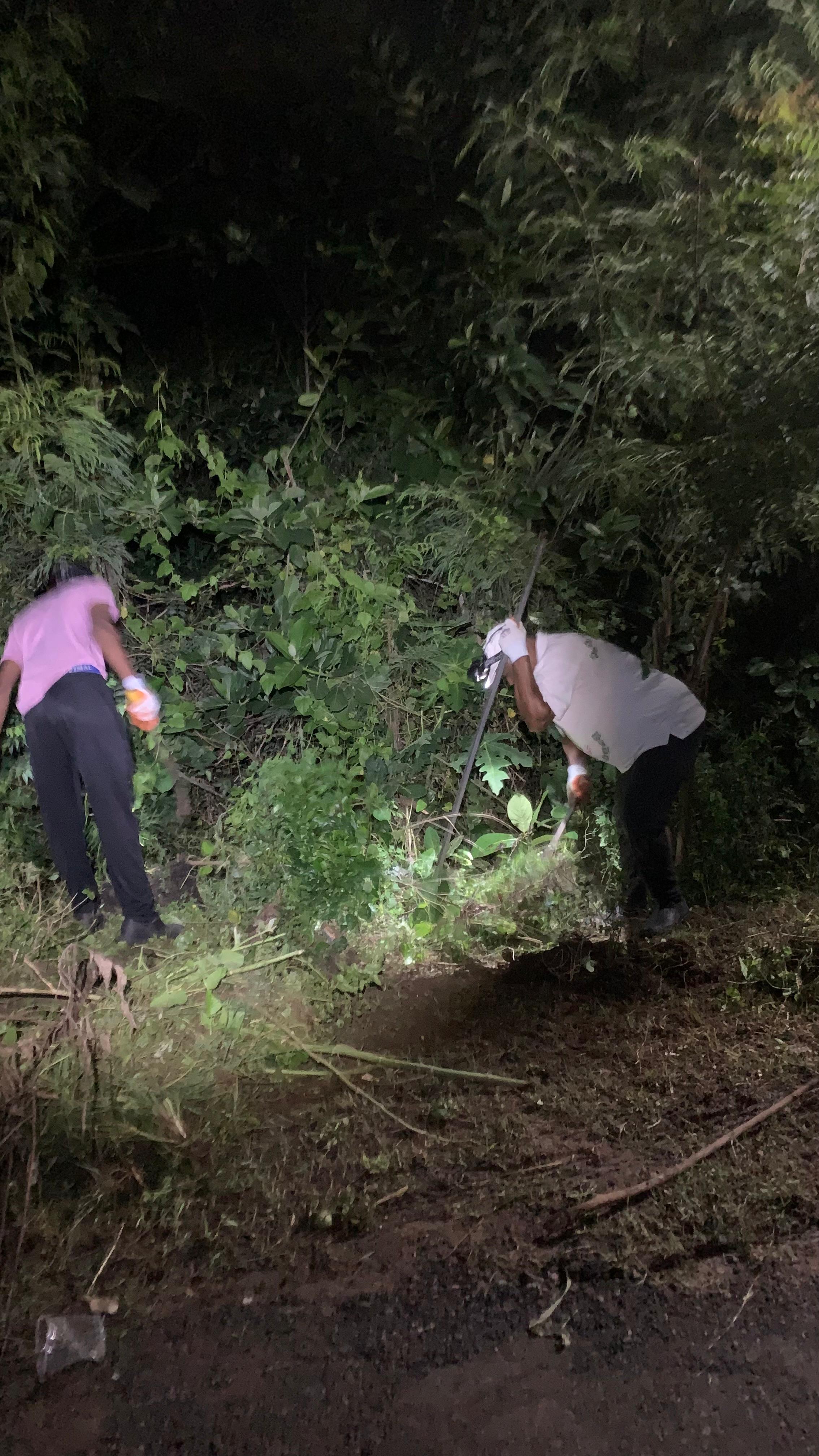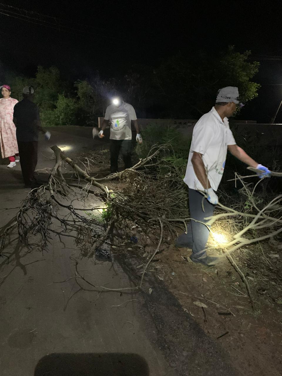 ఒక కార్యకర్త రోడ్డు ప్రక్కల అందవిహీనంగా అడ్డదిడ్డంగా ఉన్న చెట్ల కొమ్మలను ట్రిమ్మర్ సహాయంతో కట్ చేసి ఆ కొమ్మలను రోడ్డుకు దన్నుగా క్రింది భాగంలో ఒక క్రమపద్దతిలో ఇద్దరు కార్యకర్తలు సరిచేశారు.