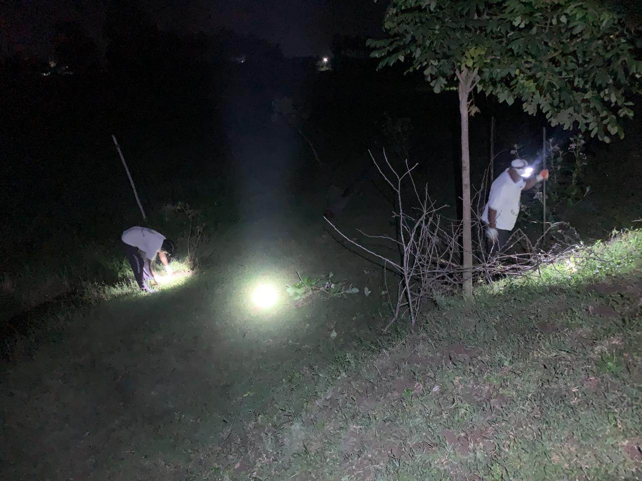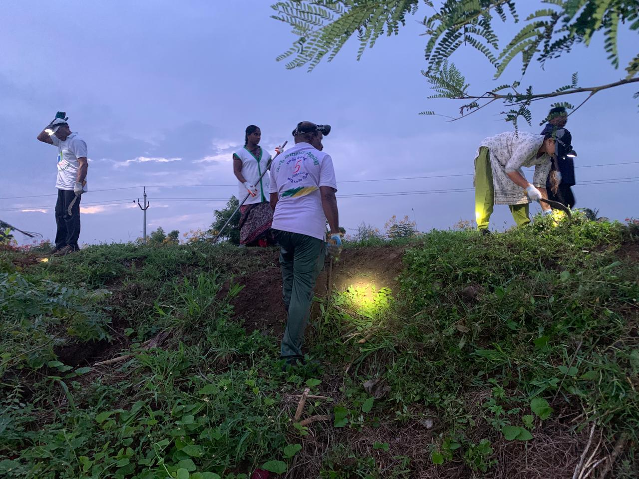 కొంతమంది కార్యకర్తల బృందం పెద్ద మొక్కలు వంగకుండా, విరగకుండా, వేర్లు బయటపడిపోకుండా బలంగా ఉండటానికి మొక్క చుట్టూ మట్టిని వేసి, కర్ర కట్టి పటిష్టం చేస్తున్నారు.