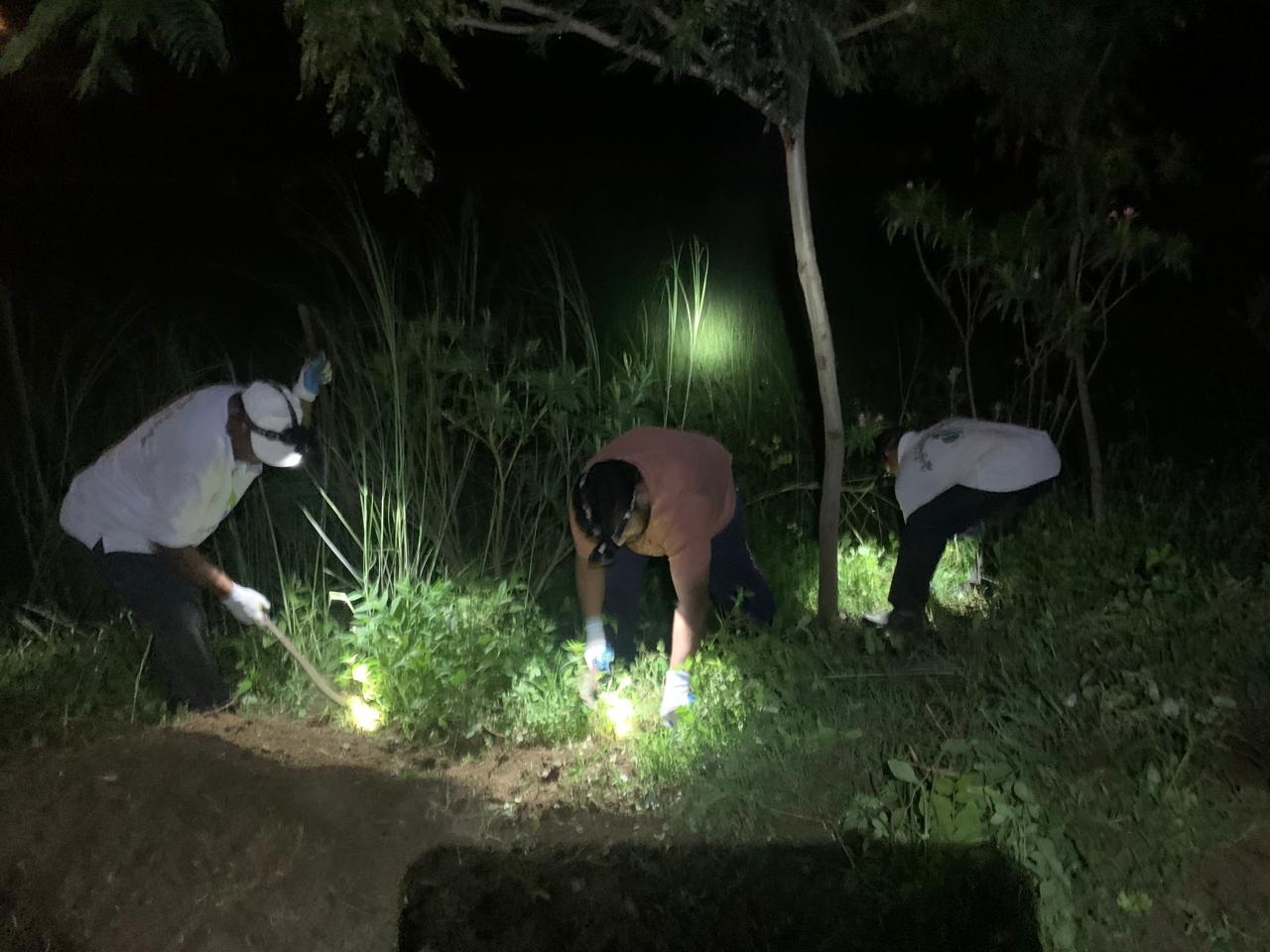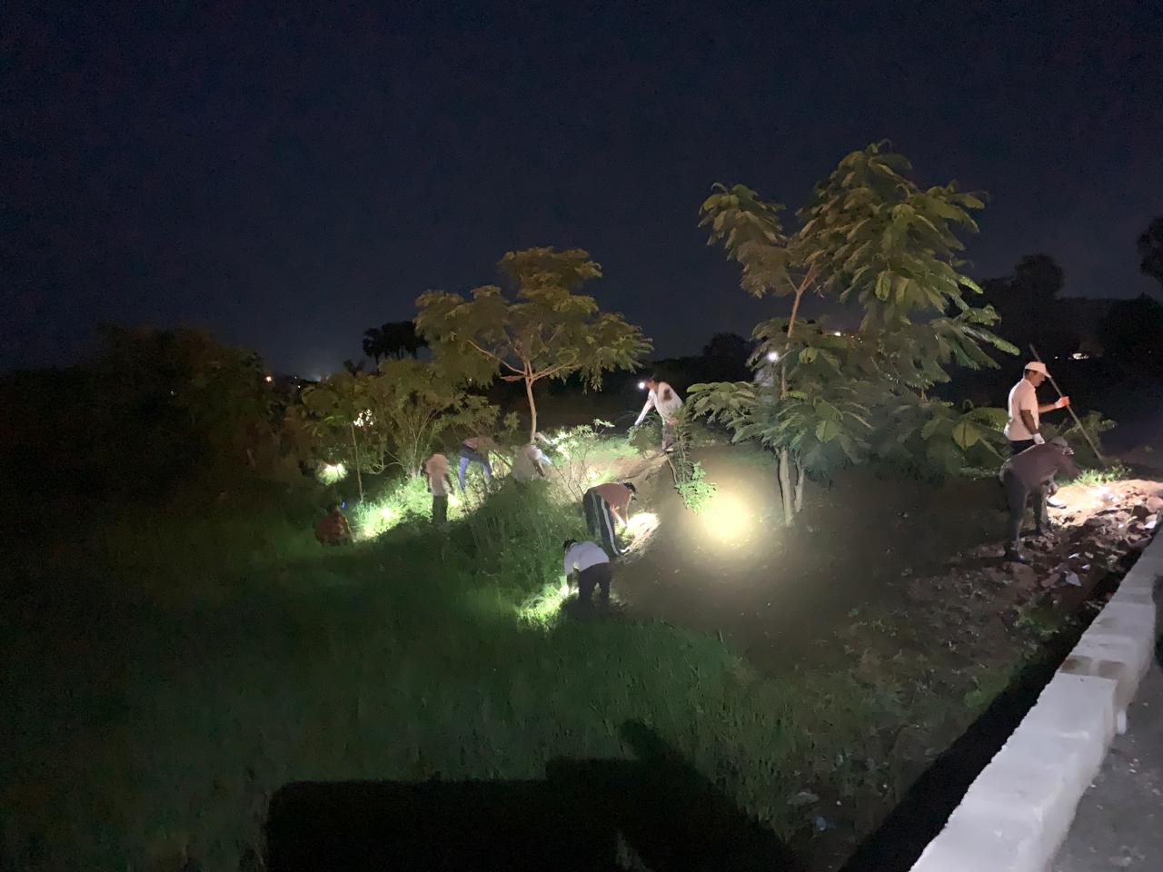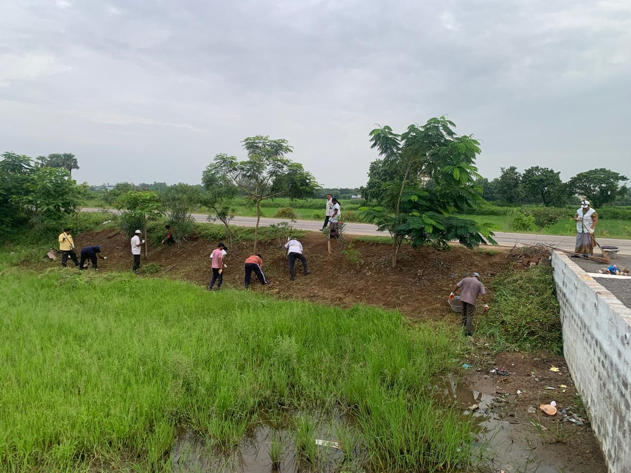 పెట్టిన మొక్కలకు రక్షణ చర్యలు చేపట్టినా ఒక సంవత్సరం నుండి ఆ మొక్కల మధ్య కలుపు గడ్డి పిచ్చి కాడ పెరిగి దట్టంగా ఉన్న చెత్తను తొలగించే పనిలో కత్తులతో నలుగురు కార్యకర్తలు ప్రక్షాళనకు దిగారు. కోసిన గడ్డిని అక్కడే ఉన్న సైఫన్ గోడ ప్రక్క మట్టి కొట్టుకుపోకుండా రక్షణగా వేశారు. మగవాళ్ళు కోసిన గడ్డి, చెత్తను మహిళలు ఎప్పటికప్పుడు తీసివేస్తున్నారు.