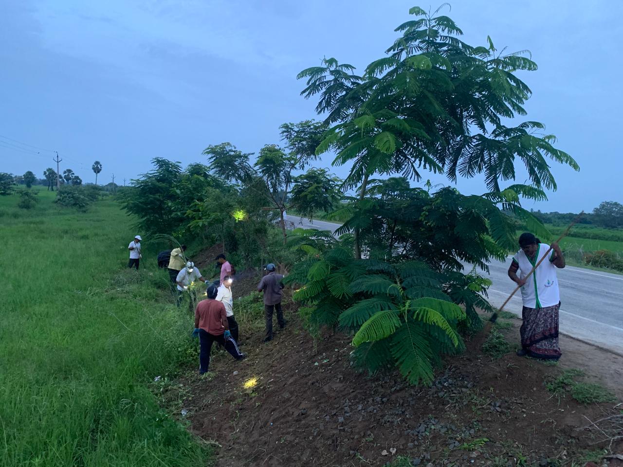 మరొక ముగ్గురు కార్యకర్తలు (సుందరీకరణ బృందం) కటింగ్ మిషన్ దగ్గర పని చేస్తూ మార్జిన్ లో కట్ చేసిన గడ్డి వ్యర్ధాలను రోడ్డు మీద లేకుండా శుభ్రం చేస్తున్నారు.