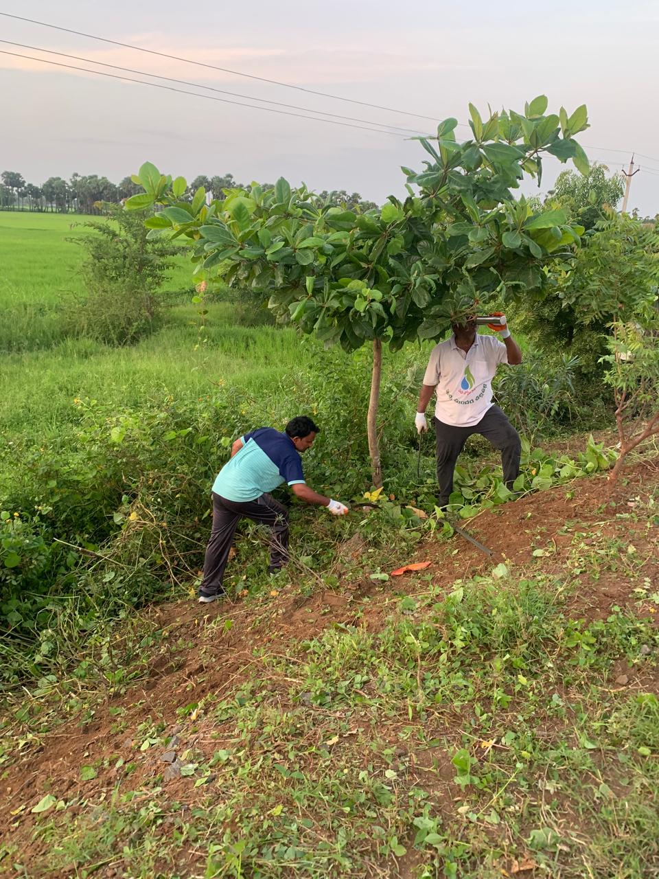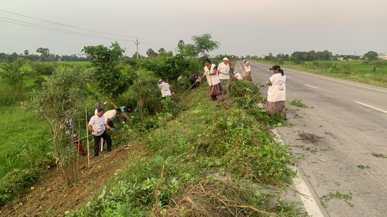 * మరొక కార్యకర్త మిషన్ చేతబట్టి దారి పొడవునా మార్జిన్ లోని గడ్డిని కట్ చేస్తూ ఉన్నారు.
