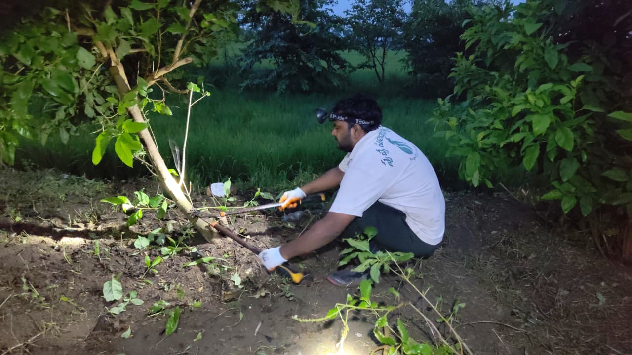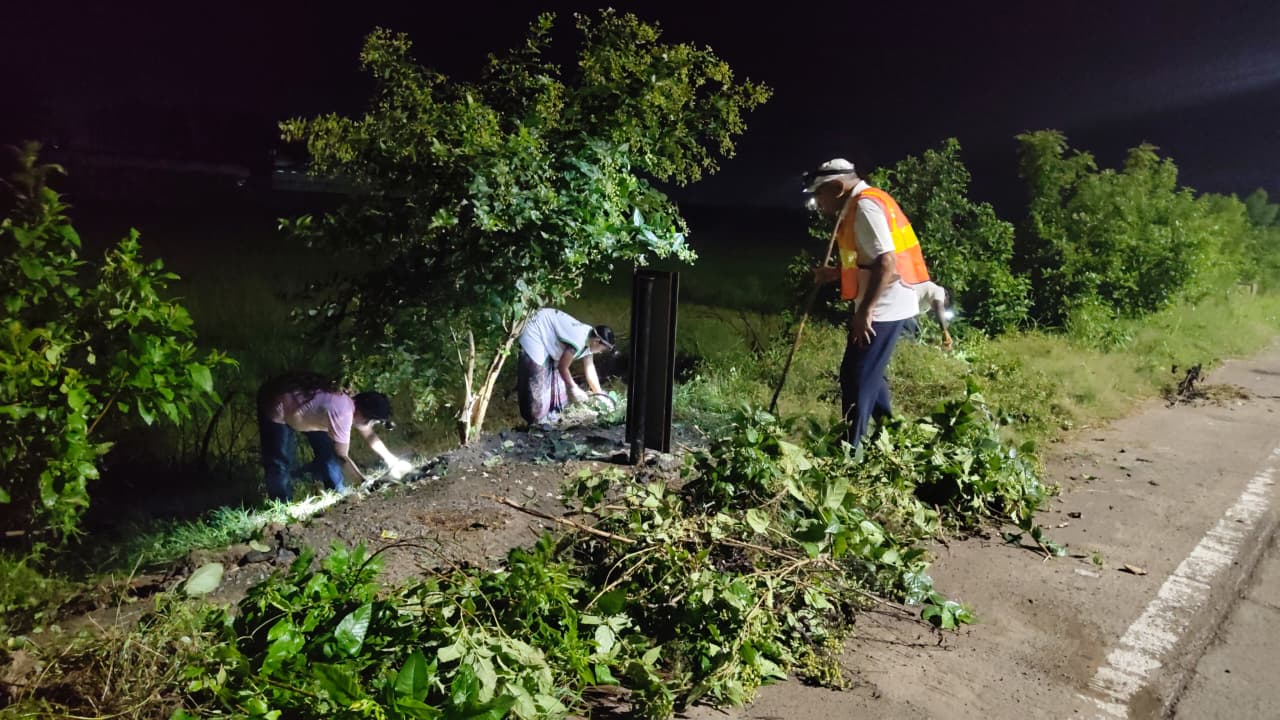 హైవేకు రెండవ ప్రక్కన ఉన్న పారిజాతం మొక్కల చుట్టూ గడ్డి ఏపుగా పెరిగి మొక్కల చుట్టూ పిచ్చి కాడ అల్లుకుని మొక్కల పెరుగుదలకు ఆటంకంగా ఉన్న కలుపును తీసివేసి శుభ్రపరిచారు.