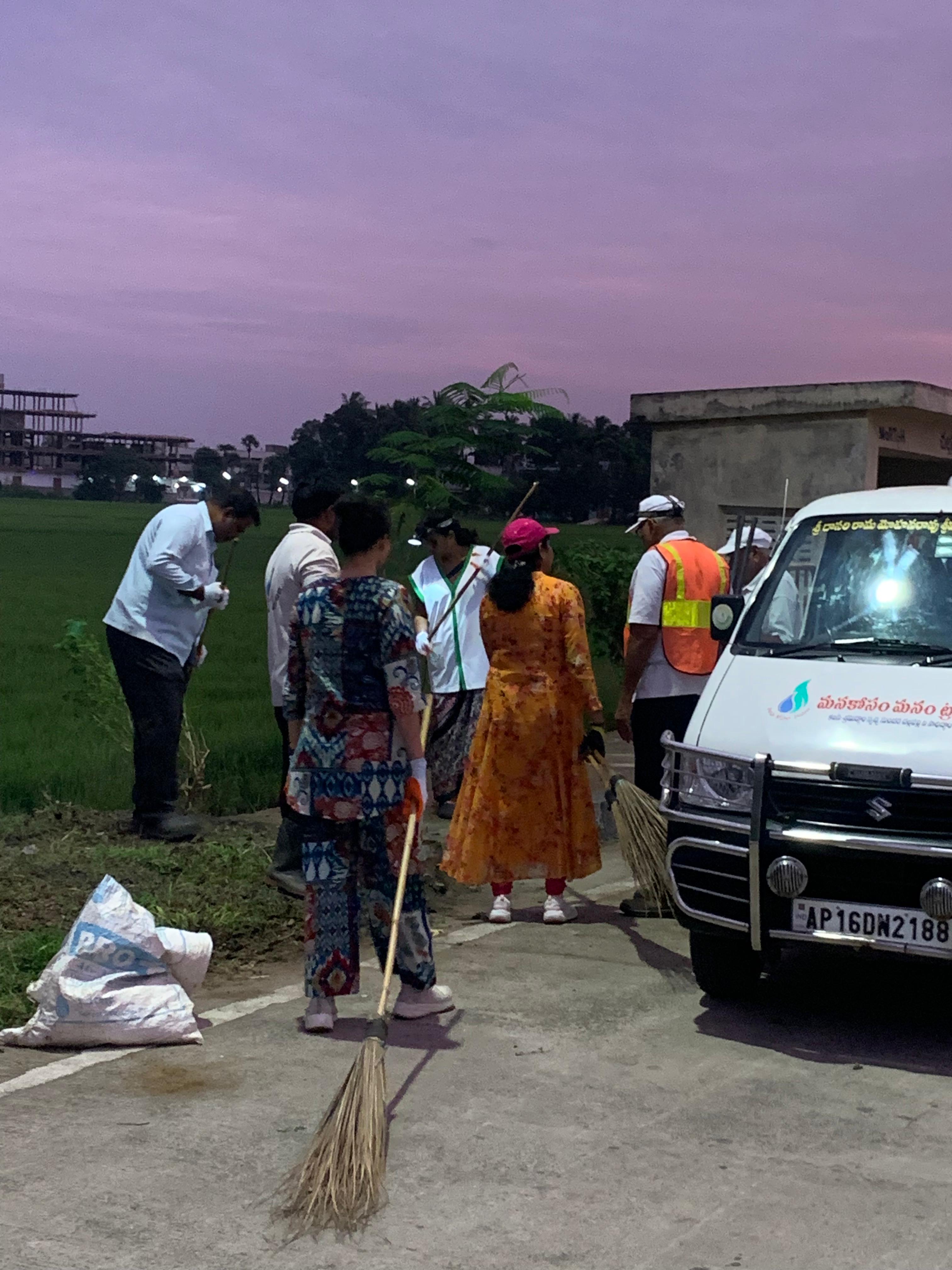 కార్యకర్తలలో ఒక బృందం (రెస్క్యూ టీం) సభ్యులు నిన్నటి చెత్తా చెదారం వ్యర్థాలను ట్రాక్టర్ లో లోడింగ్ చేస్తున్నారు. ఆ వెనుక మరొక మహిళా కార్యకర్త ఎంతో పరిశుభ్రంగా ఊడ్చి వేస్తుండటం గమనిస్తే చేసిన పని ఎంత పరిశుభ్రంగా అద్దంలా మెరుస్తుందో చూసిన వారికే తెలుస్తుంది.