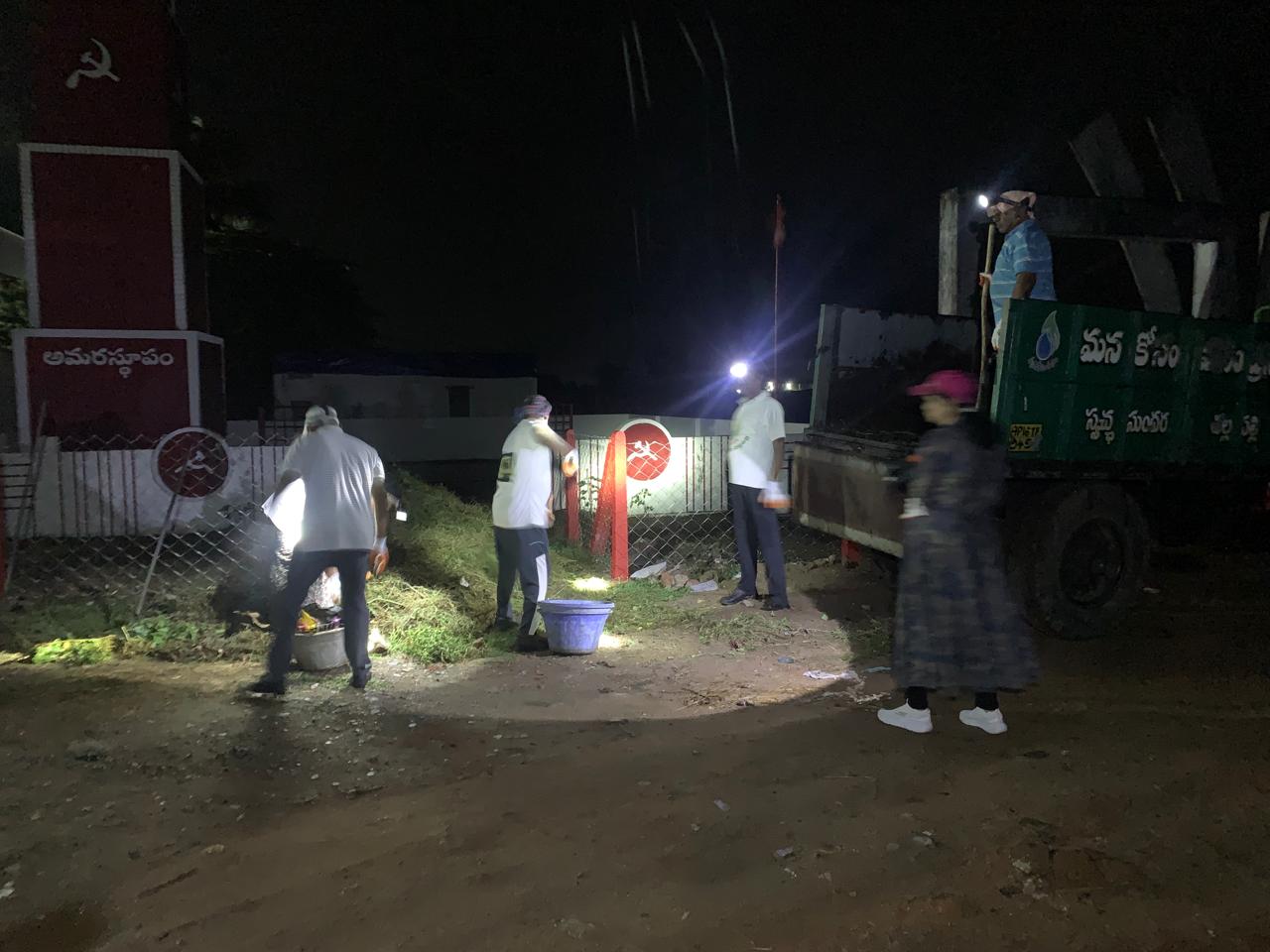 నాగాయలంక రోడ్ లోని అమరస్థూపం వద్దకు తెల్లవారుజాము 4:26 నిమిషాలకే కార్యకర్తలు చేరుకున్నారు. మొదటి ఫొటో దిగిన తదుపరి వారి వారి పనిముట్లు చేతబట్టి కార్యోన్ముఖులయ్యారు.
