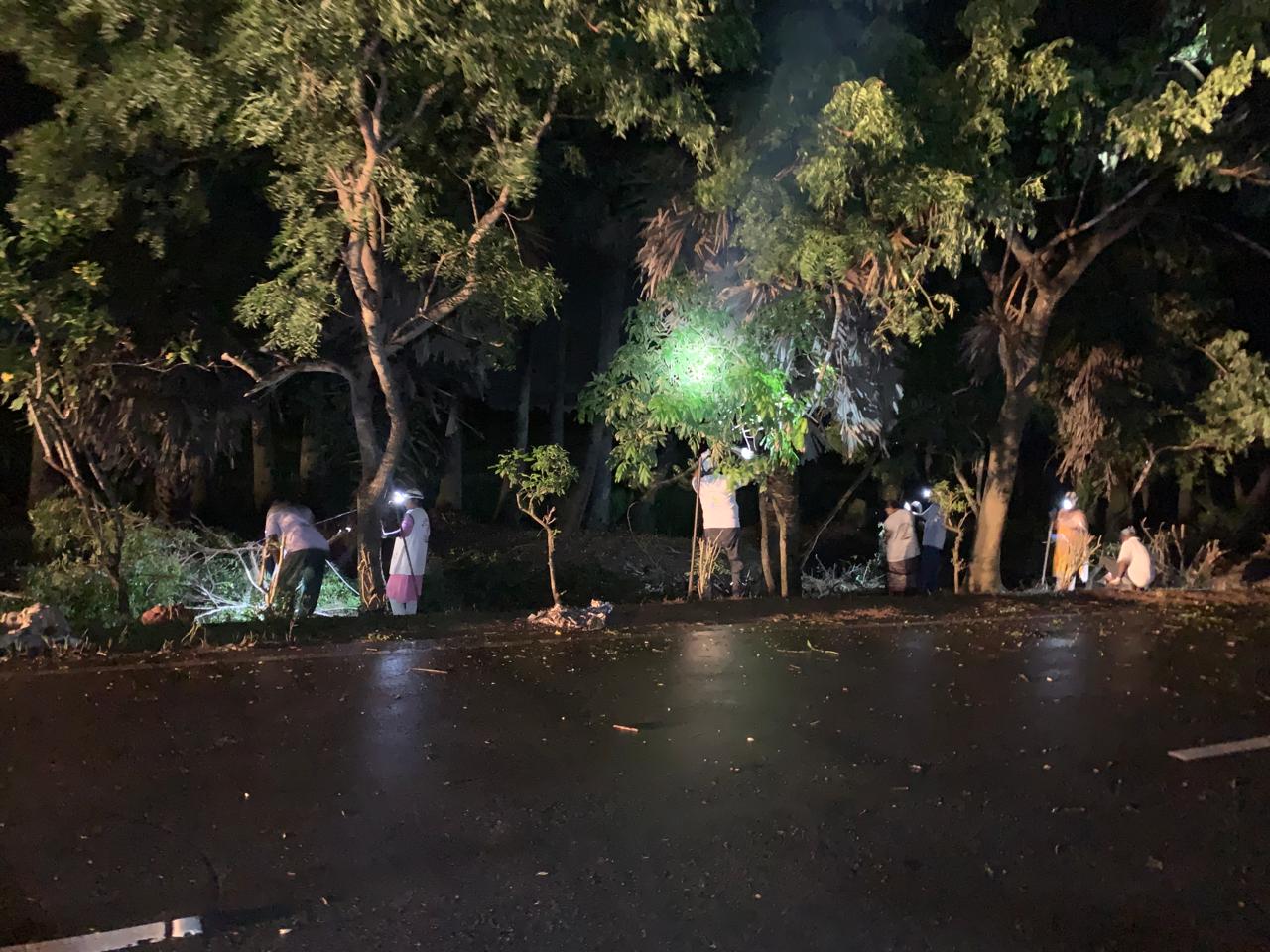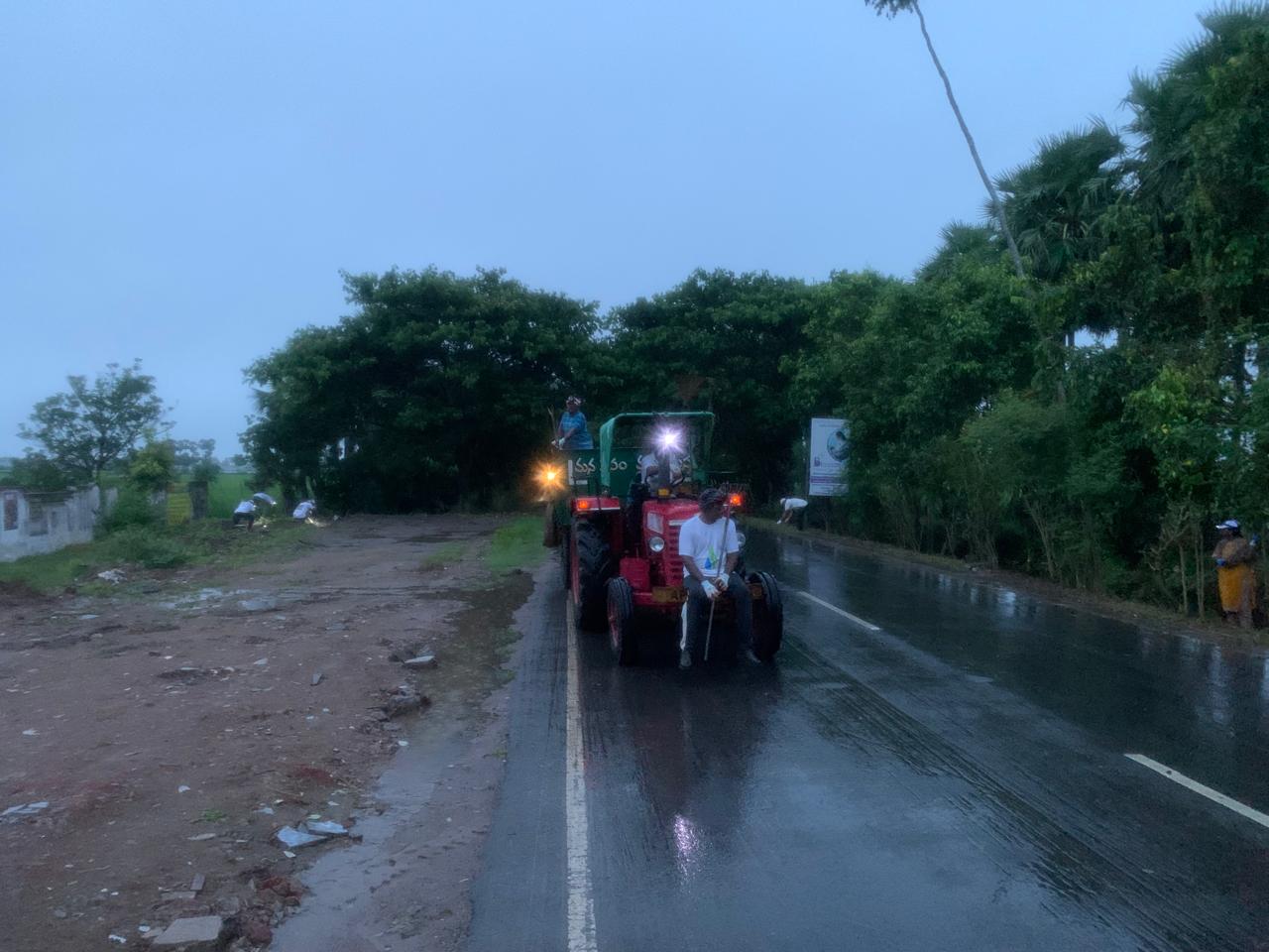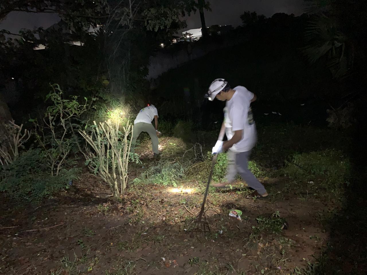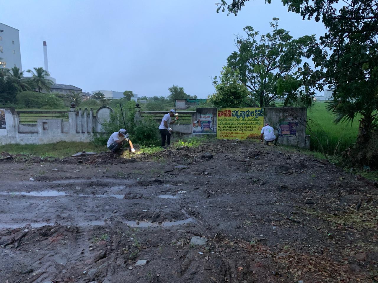 మరొక కార్యకర్త గడ్డి కటింగ్ యంత్రం చేతబట్టి సమానంగా గడ్డి కట్ చేస్తుండగా మరికొద్దిమంది కత్తులతో మిగిలిపోయిన కలుపు మొక్కలు చెత్తా అడ్డుపడే కొమ్మలు వీటన్నింటినీ తీసి శుభ్రం చేస్తున్నారు. అప్పటి వరకూ నిదానంగా కురిసిన జల్లుల వర్షం ఒక్కసారిగా పెరిగి కార్యకర్తలను తడిపి ముద్ద చేసింది.