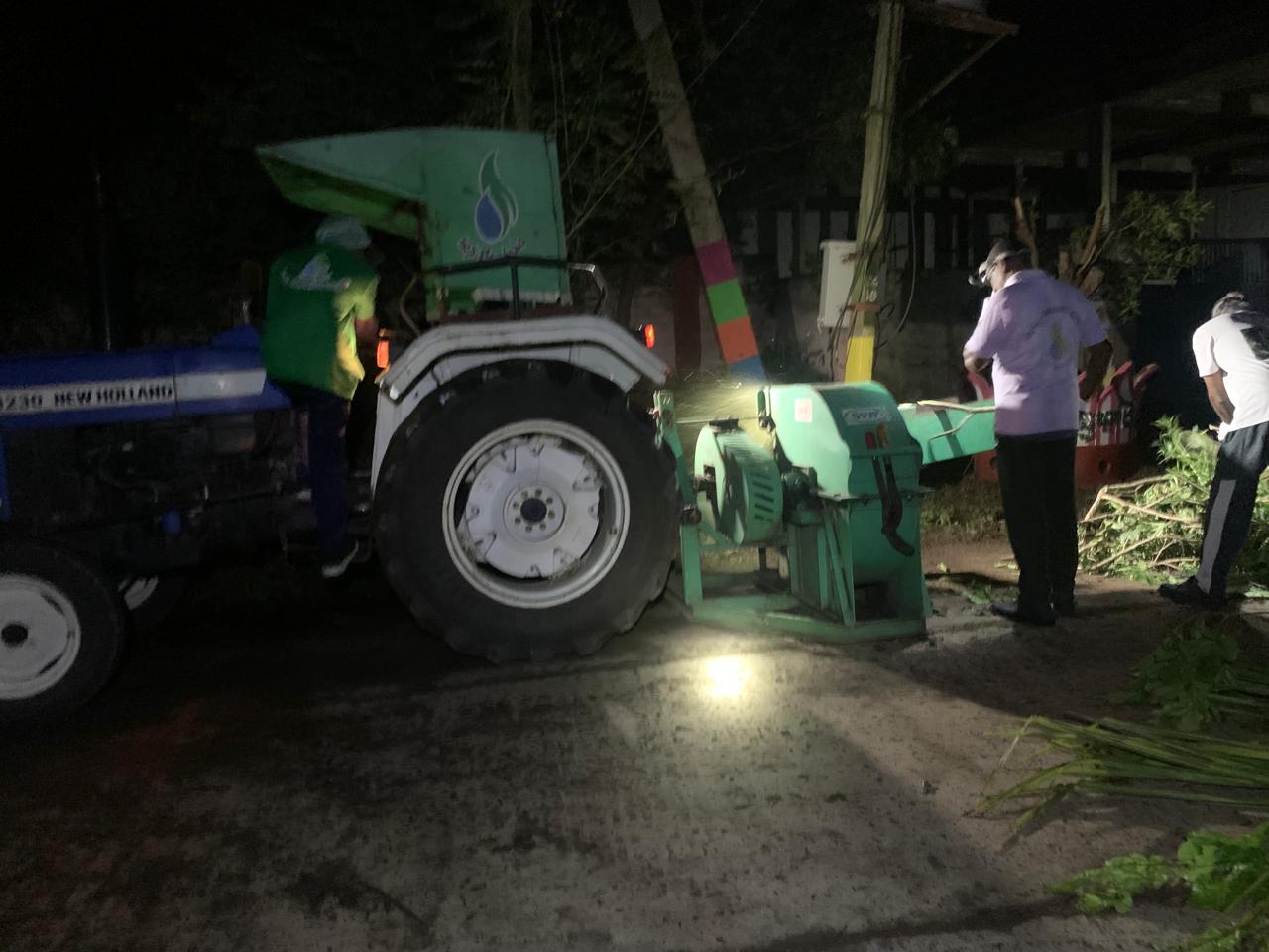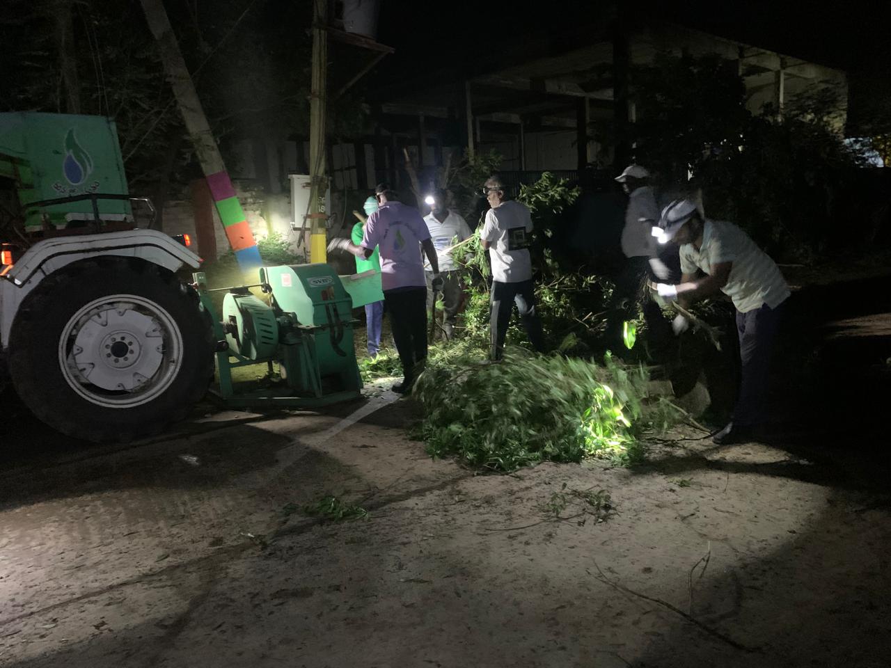 తుఫాను ప్రభావంతో 28 వ తేదీ సాయంత్రం నేలకొరిగిన చెట్లను అప్పుడు వర్షంలో తడుస్తూ ప్రక్కకు తొలగించి రహదారి సౌకర్యం కల్పించారు. కానీ అవి దాదాపు 4 ట్రక్కుల కొమ్మలు, ఆకులను డంపింగ్ యార్డ్ కు తరలిస్తే అక్కడ ఖాళీ ఆక్రమించడం తప్ప, తగలేస్తే కాలుష్యం ముప్పు వీటన్నింటికీ పరిష్కారంగా షడ్దర్ మిషన్ లో వేసి ఆకులు కొమ్మలను పొడి చెయ్యడం, మొద్దులను ఇతర అవసరాలకు కర్రలను మొక్కలకు దన్నుగా వాడడం ఇదీ రధసారది గారు కార్యకర్తలకు చెప్పిన ప్రత్యామ్నాయ పద్ధతి.