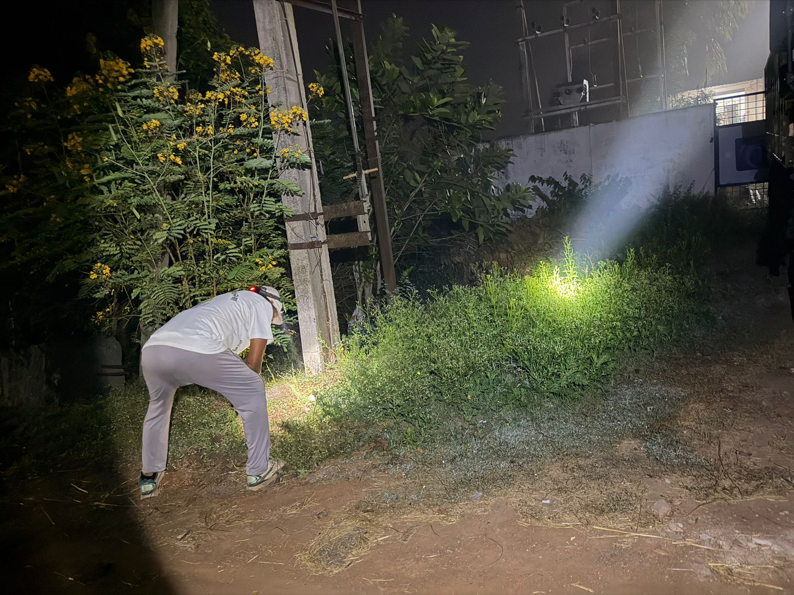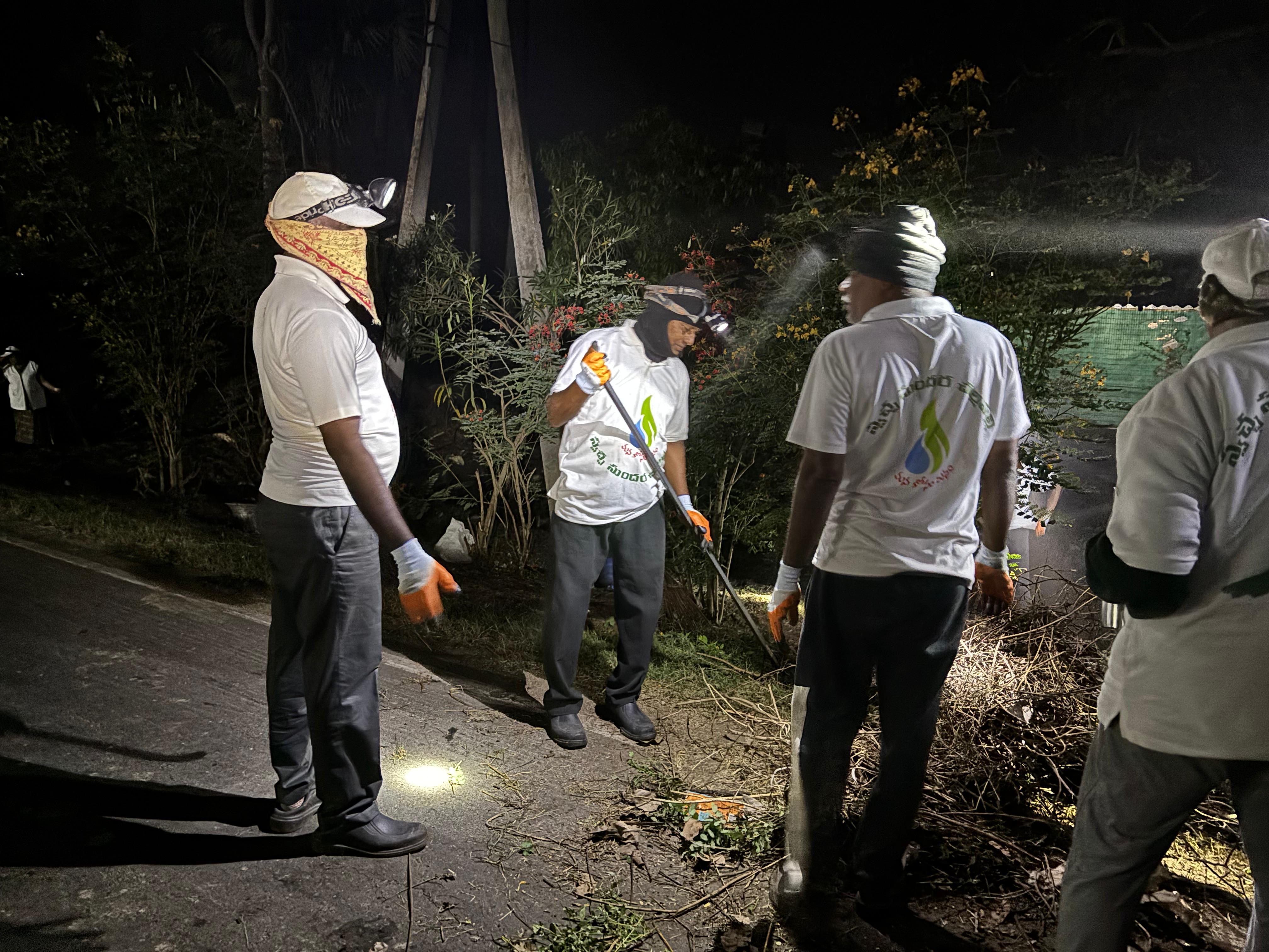 1) థర్మోకోల్ ఫ్యాక్టరీ ముందున్న గతుకుల భాగంలోనూ, డ్రైను వైపూ పెరిగిన గడ్డి, ప్రోగుబడిన ప్లాస్టిక్ వ్యర్థాలనూ పరిహరించే పనిలో ఇద్దరు కార్యకర్తలు,
