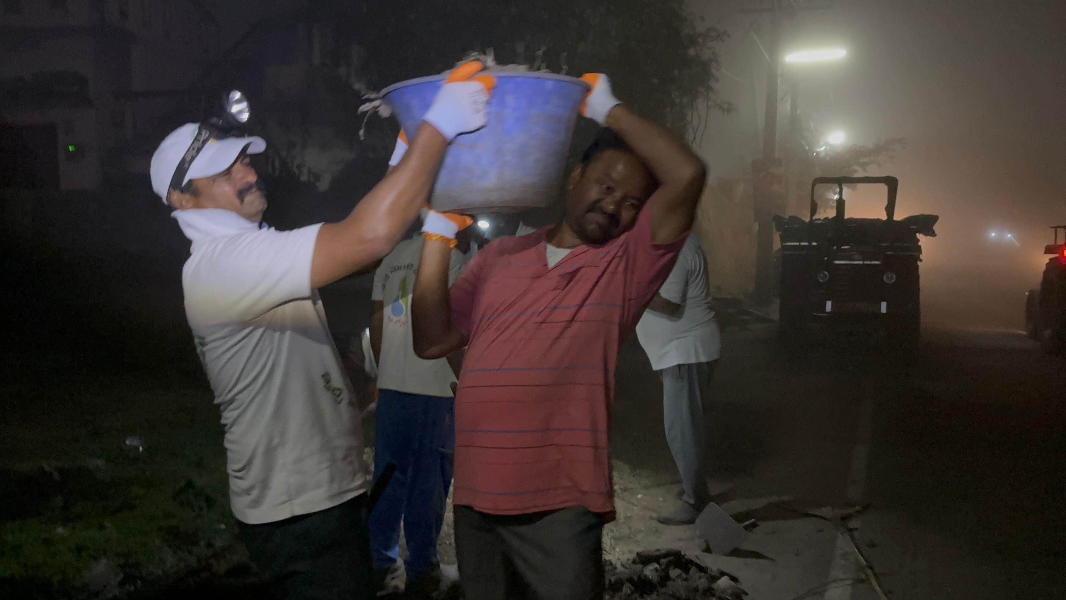 రోడ్డు మార్జిన్లలో ప్రోగు చేసిన రాతి ముక్కలు, దుమ్ము, పెంకులు 50 గజాల దూరంగా డిప్పలతో మోసి - పాగోలు బజారు ఎదుట - అంబేత్కర్ భారీ ఫ్లెక్సీ దగ్గర తారు రోడ్డుకు రక్షణగా పనికొచ్చాయి.