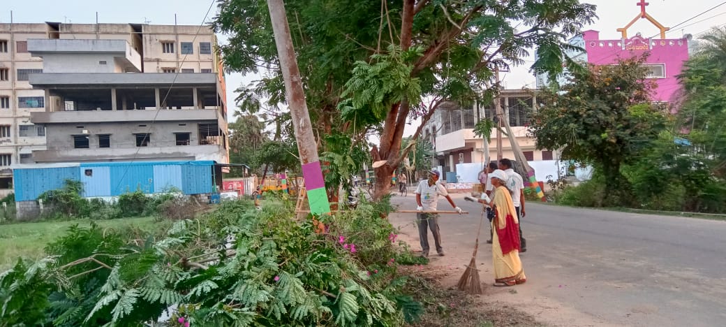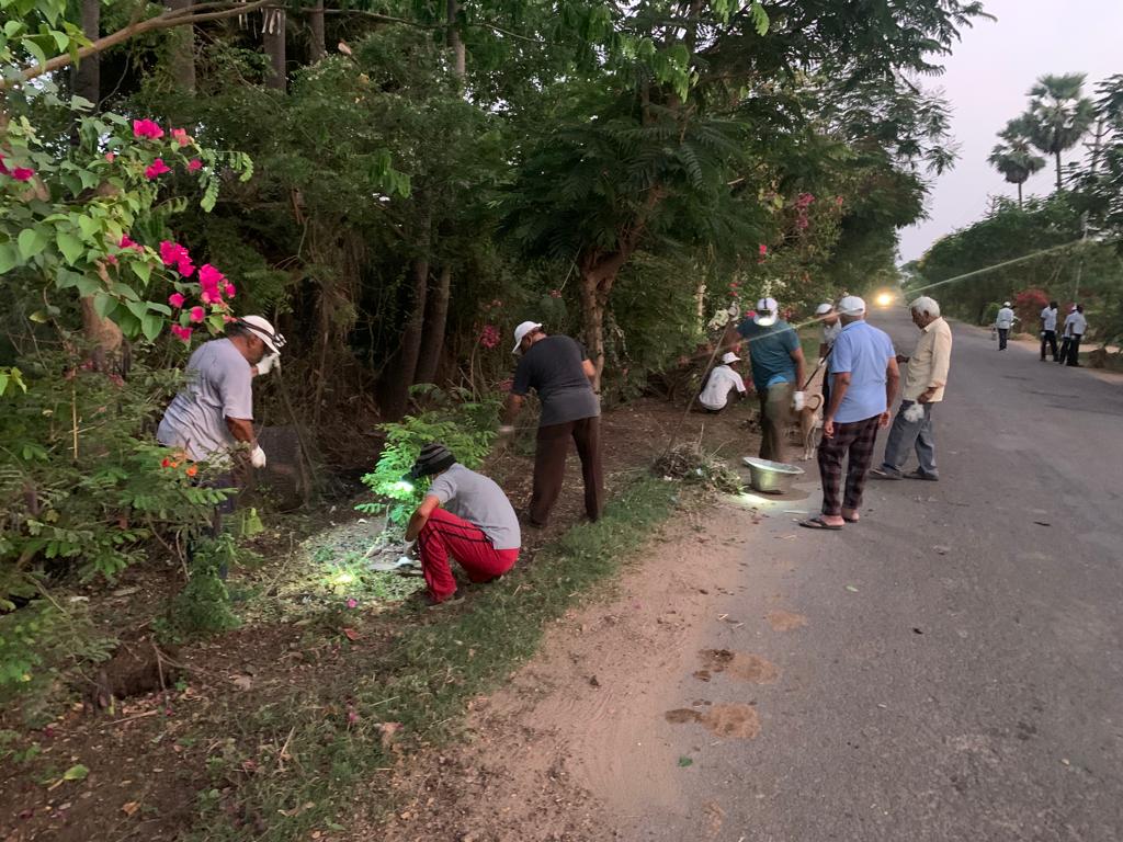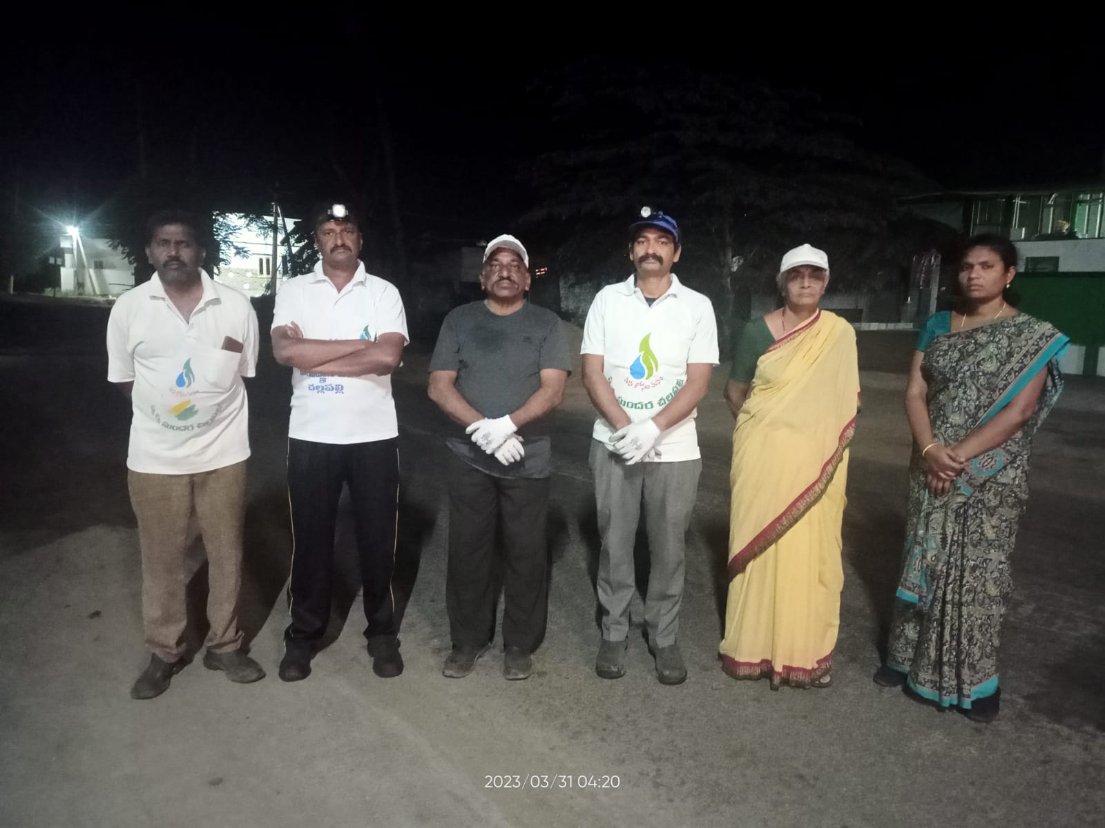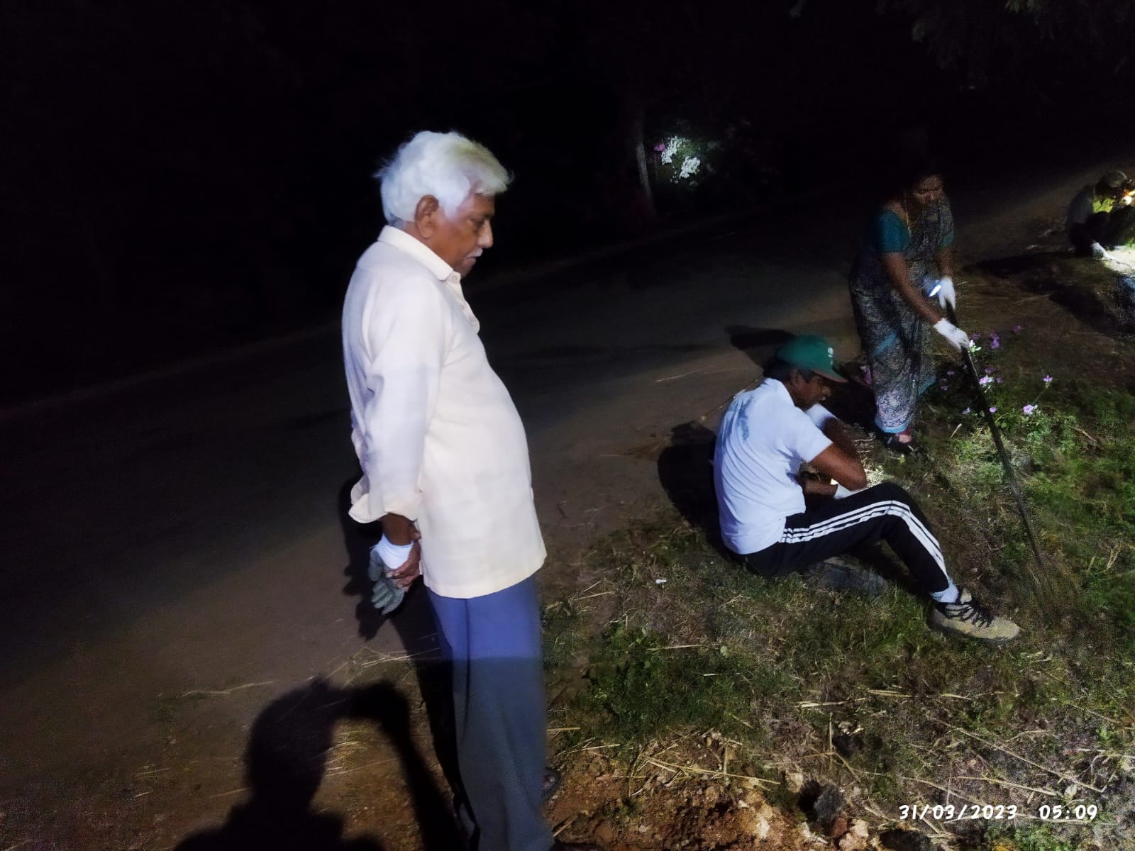 అక్కడి పూల మొక్కల పాదుల్ని సరిదిద్దినా, రోడ్డు మీదికి పూలకొమ్మలు వస్తుంటే కత్తిరించి నా రోడ్డును ఊడ్చినా - రకరకాల వ్యర్ధాల్ని గుట్టలుగా లాగి, డిప్పల్తో మోసి, ట్రాక్టర్ లో నింపినా - ఒక కార్యకర్త గట్టిగా త్రొక్కి సర్దినా - ఈ అన్ని పారిశుద్ధ్య చర్యలకూ కర్తలు ఈ కొద్ది మందే! కరెంటు తీగకు దెబ్బ తగిలి, విద్యుత్ ప్రసారం నిలిపినా - అందుకే చీకటైనా తమ పని ఆపలేదు!