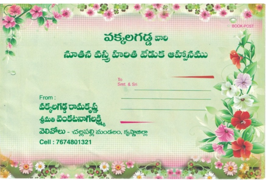 మా స్వచ్ఛ చల్లపల్లి కార్యకర్త ‘రామకృష్ణ, అతని భార్య నాగలక్ష్మి’ వాళ్ళ అబ్బాయి ‘సాధ్వి’ పంచల వేడుకకు శుభలేఖ ఇచ్చారు. కార్డు మీద ‘నూతన వస్త్ర హరిత వేడుక ఆహ్వానము’ అని ప్రింట్ చేయించారు.