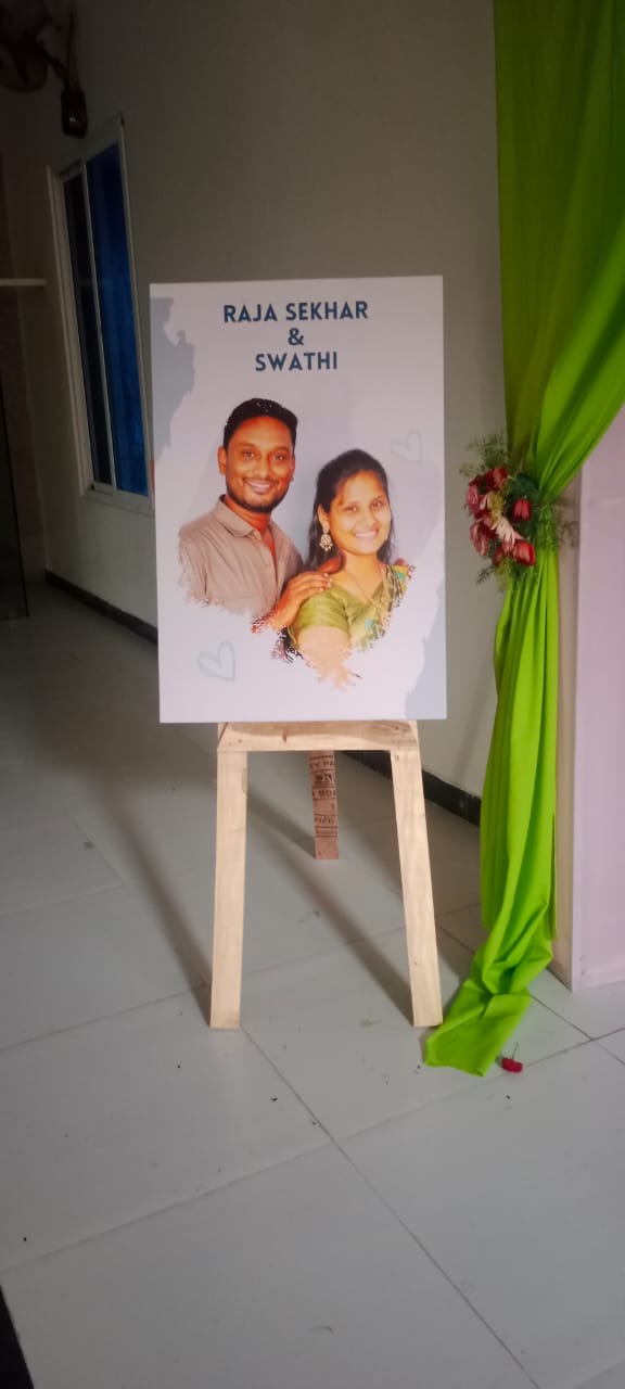 ఈరోజు జరిపిన తమ కుమార్తె ‘స్వాతి’ వివాహ పరిచయ వేడుకలో ఫ్లెక్సీ బదులు గుడ్డ బ్యానర్ నే రాయించారు.