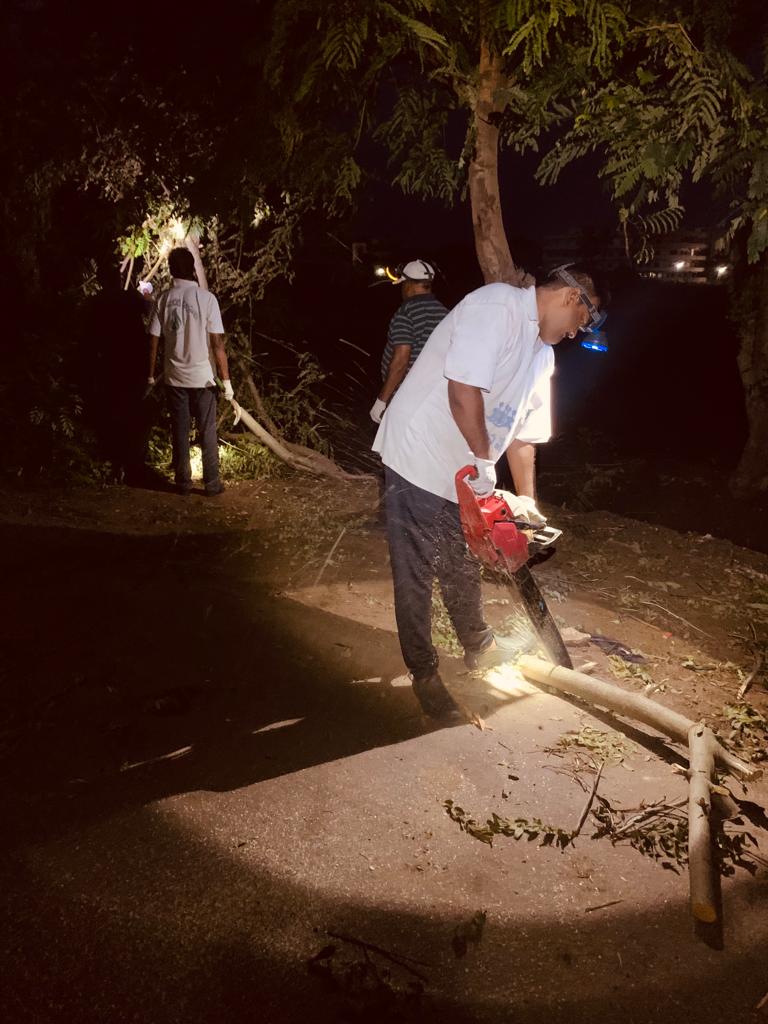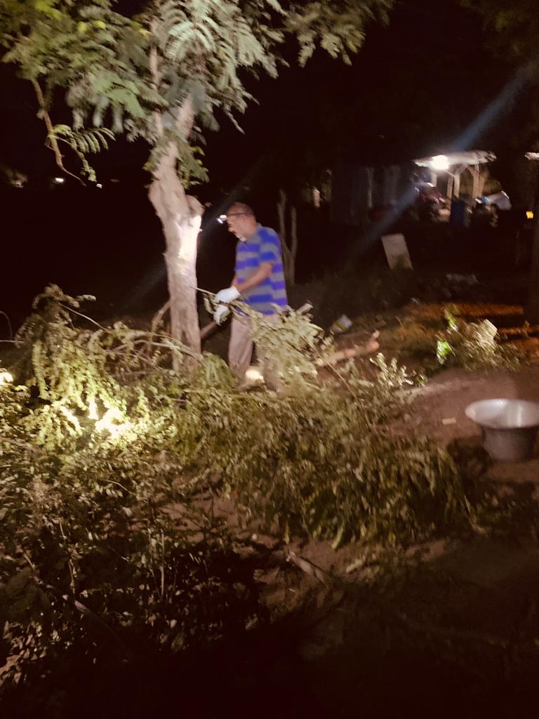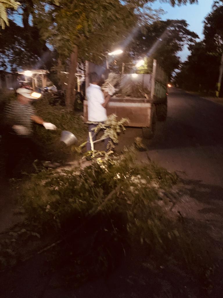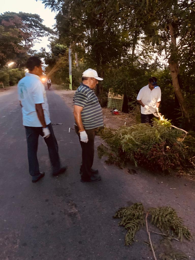 నిన్నటి వాయుదేవుడి పరాక్రమానికి విరిగి రహదారి కడ్డంగా పడిన చెట్టు కొమ్మల్ని తొలగించి, వాహనాలకు సౌకర్యం కలిగించుట – అందుకు గాను కత్తులో – గొడ్డలో – సమయానుగుణంగా వాడుట!