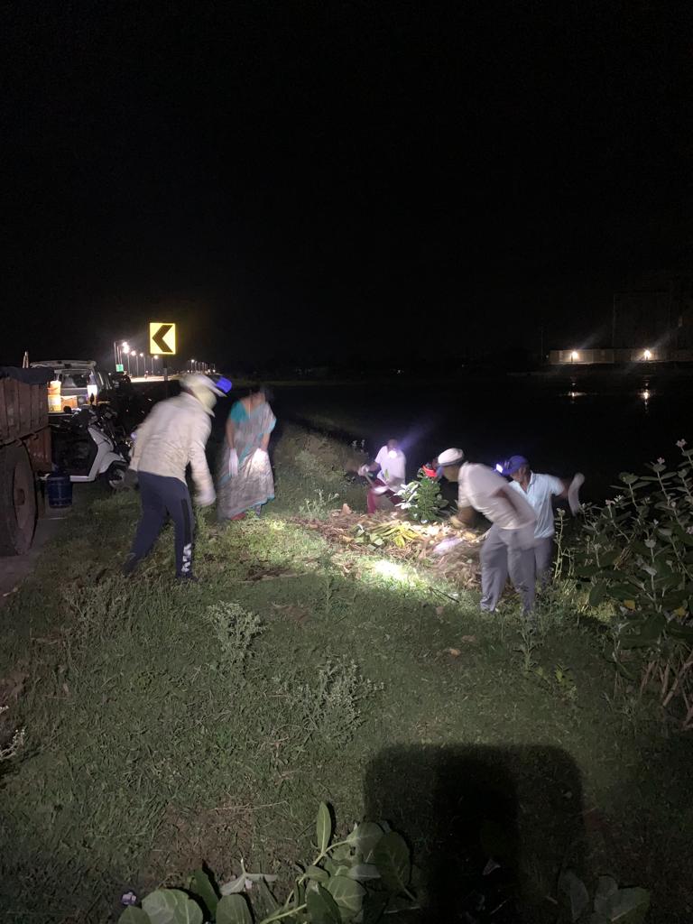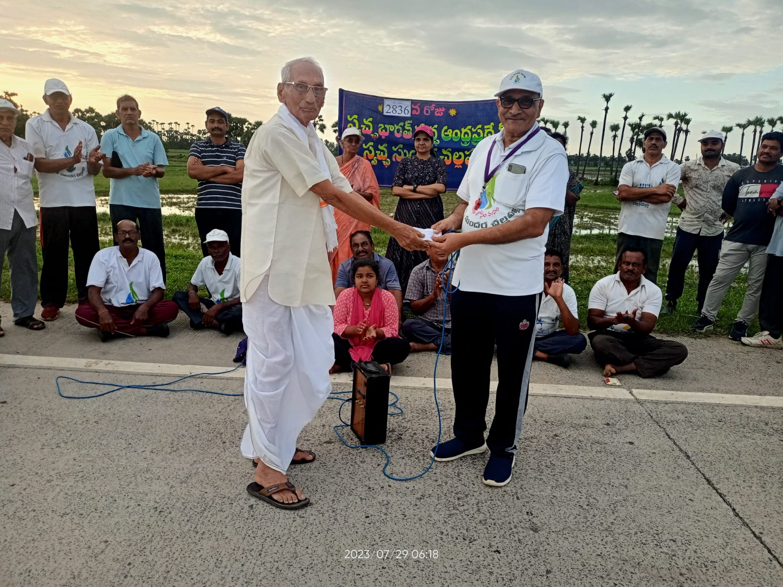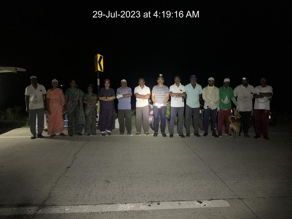 29-7-23 బ్రహ్మ కాలం (4.18 ని.) లో 15 మందే కనిపిస్తున్నా అనతి నిముషాల్లోనే పెరిగి పెరిగి కార్యకర్తల సంఖ్య 33 కు వెళ్లింది! పని స్థల మానం - కాసానగర్ దగ్గర బందరు – ఒంగోలు నేషనల్ హైవేకి ఇరుదిశలా 200 గజాలు! పనుల్లో కాలూ - వేలూ పెట్టిన వాళ్లు 5 నుండి 91 ఏళ్ల వారు!