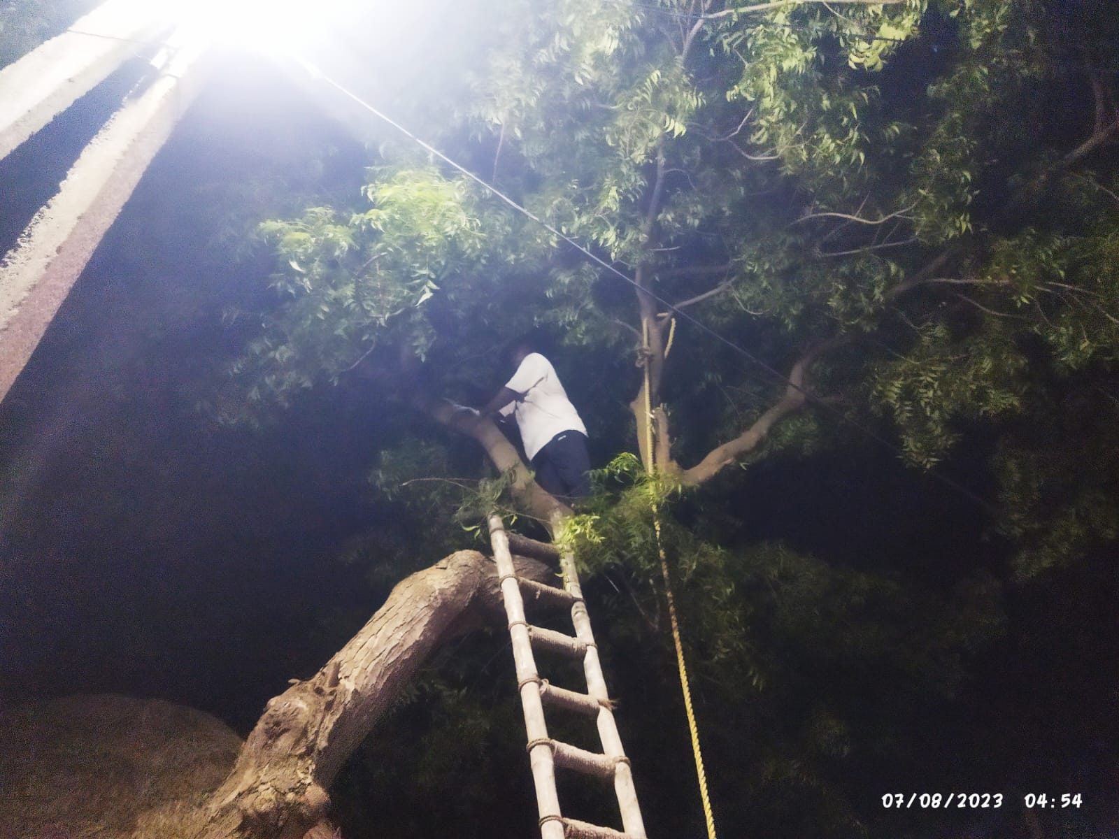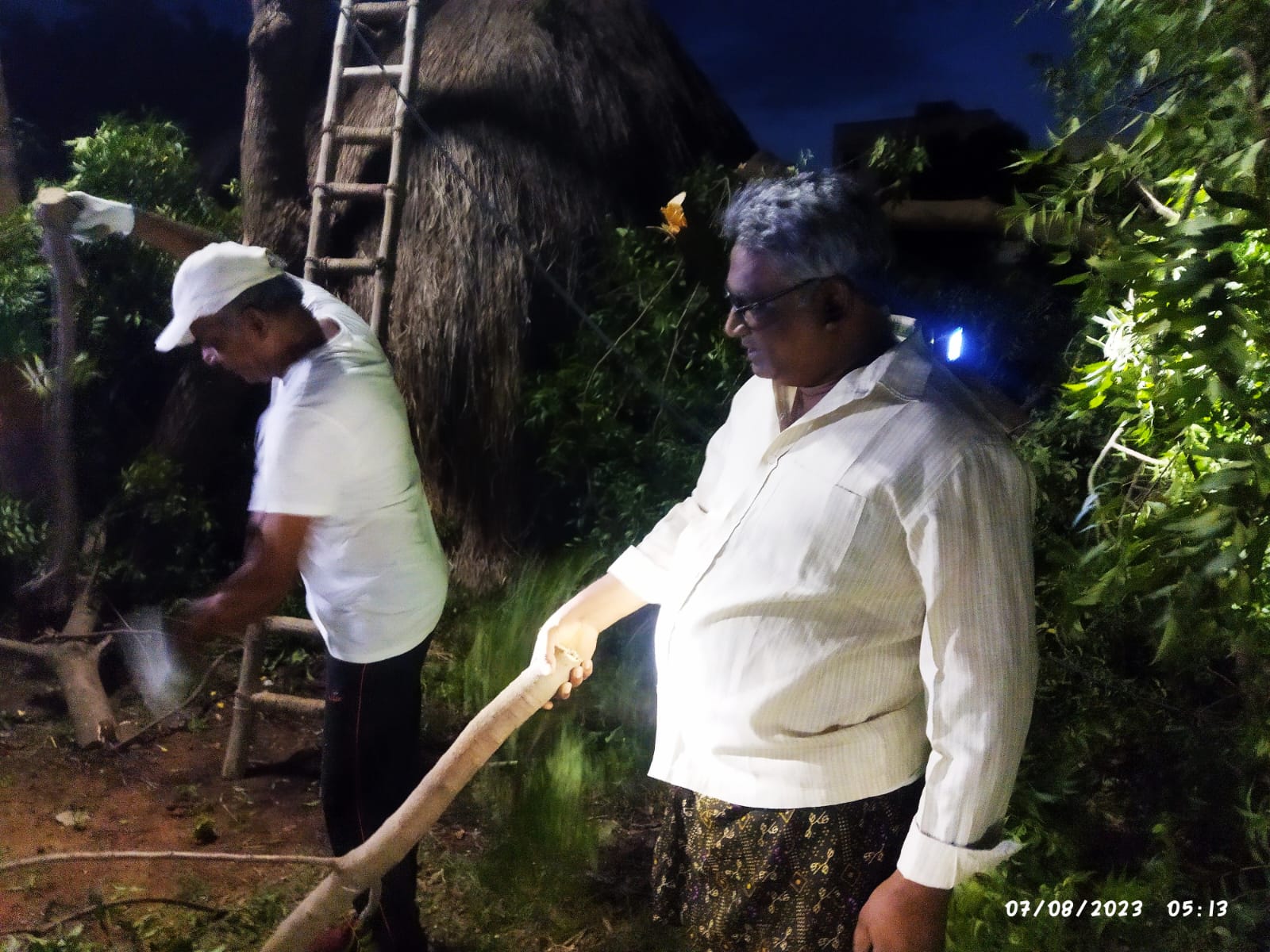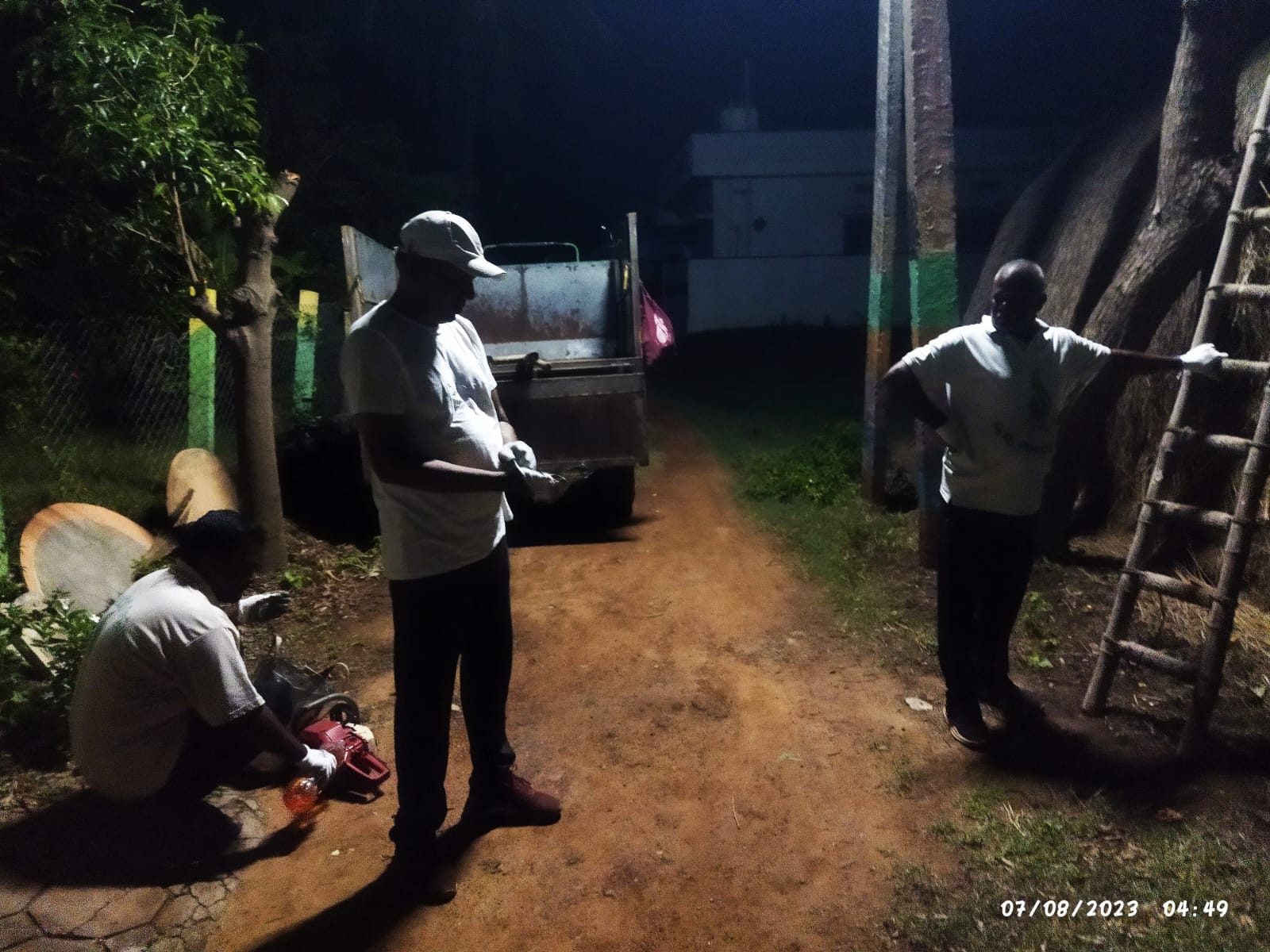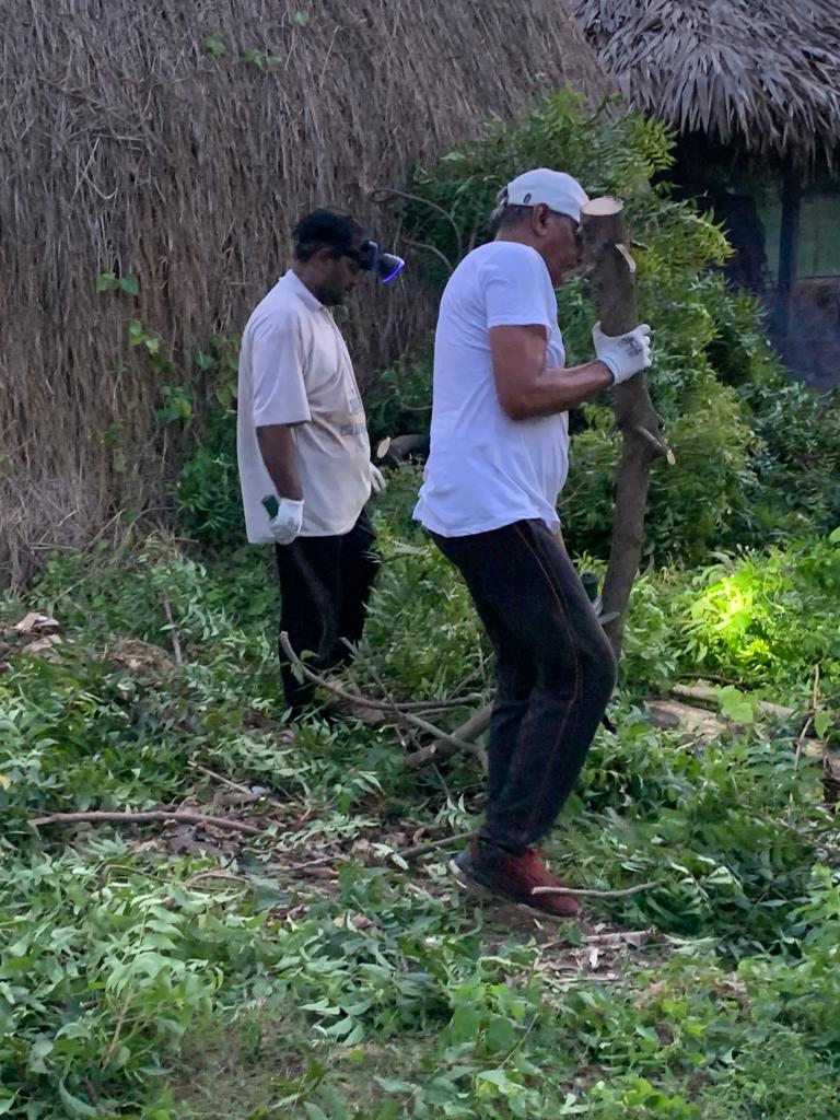 క్రింద ట్రాక్టర్లో నిలిపిన పొడవాటి నిచ్చెనా, దాని మీదుగా కార్యకర్త ఎక్కిన చెట్టు కాండమూ, చేతిలో రంపమూ, రంపమూ/గొడ్డలీ దెబ్బకు క్రిందపడ్డ కొమ్మలూ, సదరు కొమ్మల్ని ఖండ ఖండాలుగా విడమరచి, ట్రాక్టర్లో నింపుతున్న నలుగురైదుగురు పనిమంతులూ