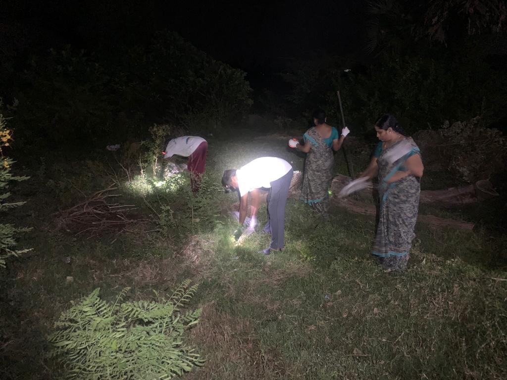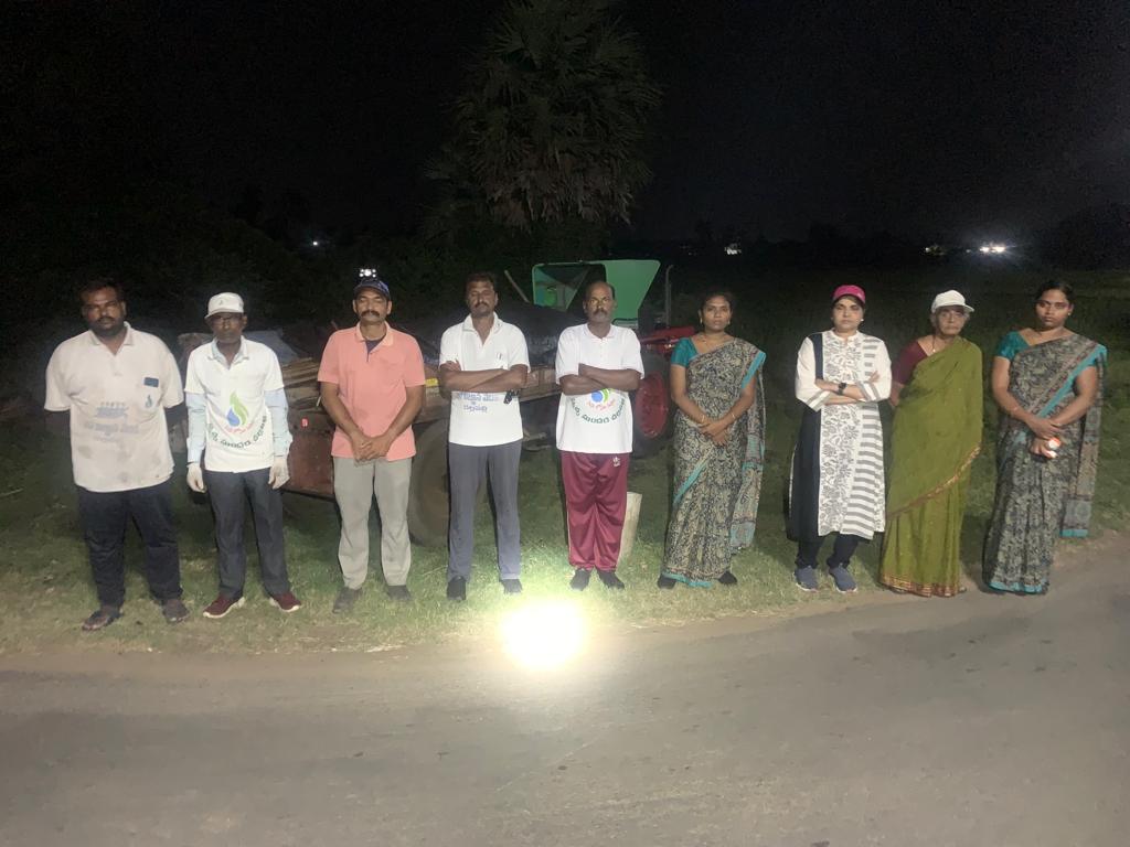 నిన్న ప్రోగుపడిన వ్యర్థాల గుట్టను నలుగురు మోసుకుపోయి, మురుగు కాల్వ అంచున పరిచి, సర్దడం,