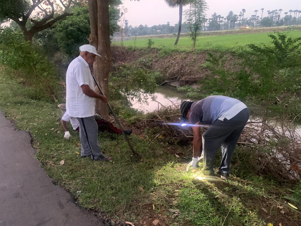 అదీ గాక – పని జరుగుతున్నది పెద్ద మురుగు కాల్వ దక్షిణపు గట్టున కావున, ఇరుకు చోట్ల జాగ్రత్తగా మసులుకోవలసి రావడం కూడ ఇంకో కారణం ! నిన్నా- నేడూ శ్రమదానంతో వంతెన దాక శుభ్ర పరచే లక్ష్యం నెరవేరలేదు!