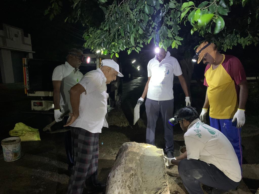 అన్నట్లు - ఈ వేకువ జరిగింది వడ్రంగి పని కన్నా తాపీ పనే ఎక్కువలా ఉంది. గత రెండు పని దినాల్లో నిరుపయుక్తంగా పడున్న పెద్ద వృక్ష కాండాన్ని చిత్రిక పట్టి కూర్చొనే బల్లగా చెక్కిన కార్యకర్తలు ఈ వేకువ ఇసుక – సిమెంటు – చిప్ లు కలిపి కాంక్రీటుగా చేసి, సదరు భారీ వృక్ష కాండం తొర్రను నింపి, వానకు తడవకుండా పట్టాలు కప్పి, నేటి పని ముగించారు!