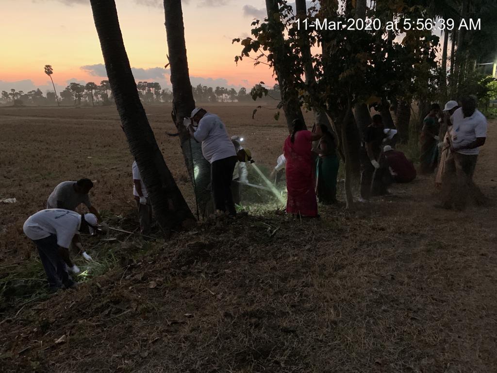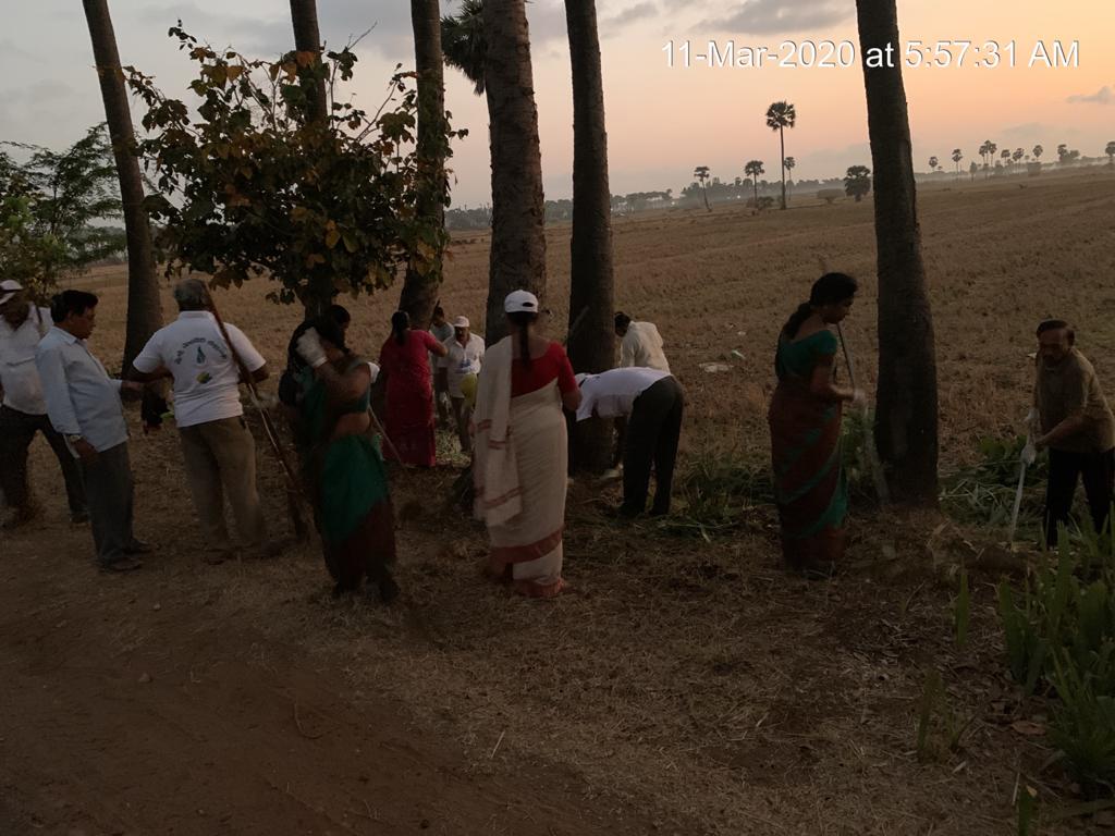 1. శివరామపురం మార్గంలోని మేకల డొంక వంతెనకు కొంత దూరంలో తమ పనిముట్ల వాహనాలను నిలిపి, 20 మంది కార్యకర్తలు కొడవళ్లు- చీపుళ్లు- గొర్రుల వంటి తమ ఆయుధాలతో ఒక వంక పొలం గట్టు మీది, మరొక వంక డ్రైనులోని సమస్త దుర్భర వ్యర్ధాలనూ నరికి-పీకి- ఊడ్చి, పోగులు చేసి, ట్రాక్టర్ లో నింపుకొని, చెత్త కేంద్రానికి చేర్చారు. (రెండు డిప్పల నిండా-100 ఖాళీ మాదక సీసాలు మన మద్య సంస్కృతి వైభవానికి గుర్తు!)