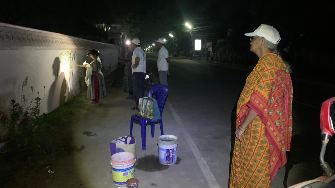 ప్రాత పబ్లిక్ లెట్రిన్ల వెలుపల గోకుడు పారల్తో గడ్డి చెక్కి, గోడల్ని పగలగొట్టబోతున్న జువ్వీ, రావి చెట్ల మొలకల్ని నలుగురు తొలగించి, సదరు గోడల మన్నికకు హామీ ఇస్తుండగా –