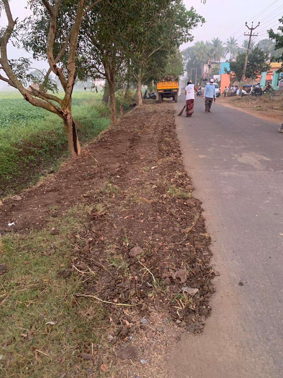 2) మరింత కష్టమైన వీధి ఉభయ మార్జిన్ల పల్లాలను సుమారు 30 గజాల మేర పూడ్చుట, ముఖ్యంగా రోడ్డు పడమటి ప్రక్కన చూడండి - గజం వెడల్పు పెరిగింది. డ్రైను మురుగు మట్టిని త్రవ్వడమూ, పారల్తో డిప్పలు నింపడమూ, ఇద్దరవి మోసుకుపోయి అవసరమైనంత మేరకు సర్దడమూ!