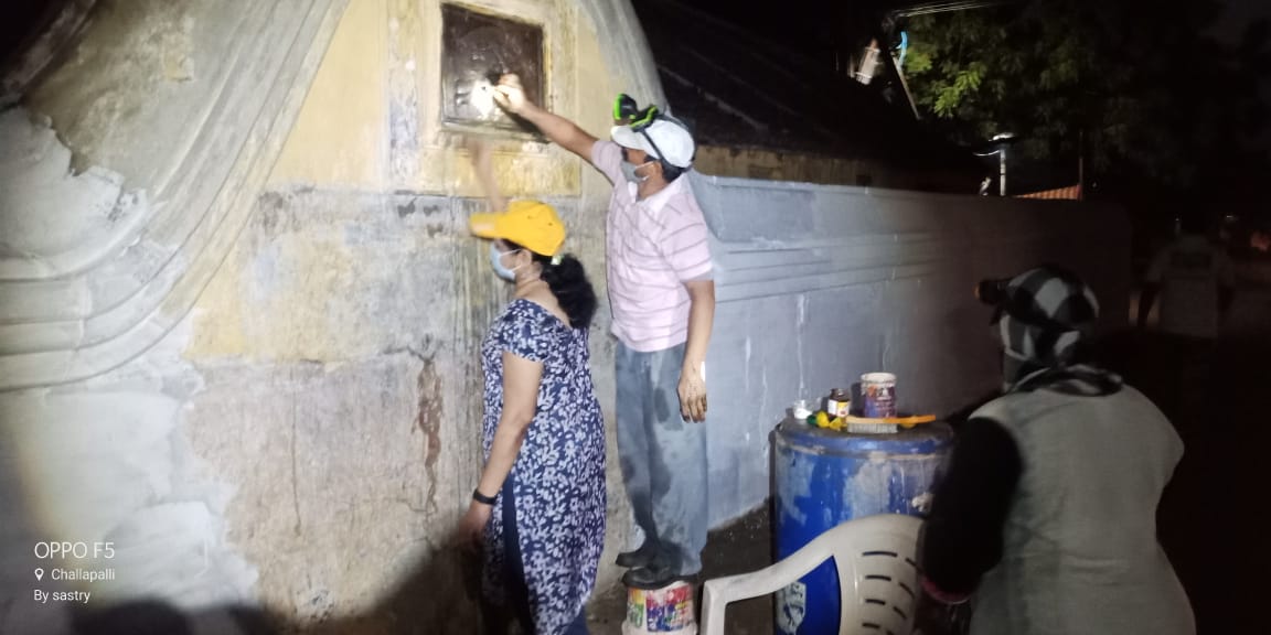 గ్రామ సుందరీకరణ కంకణ బద్ధులు అమరావతి రాజా గారి “ వైజయంతము” ప్రహరీకి నిన్నటి కృషి తరువాయిగా కొందరు ఆ పెద్ద గోడను గోకి, వెలిసిన రంగును దులుపుతుంటే- మరికొందరు దానిని శుభ్రంగా కడిగి ఆరబెట్టి, ప్రైమరు పూశారు. ఈ భారీ కుఢ్య సర్వాంగ సుందరీకరణకు ఈ పూత నాంది అన్నమాట!