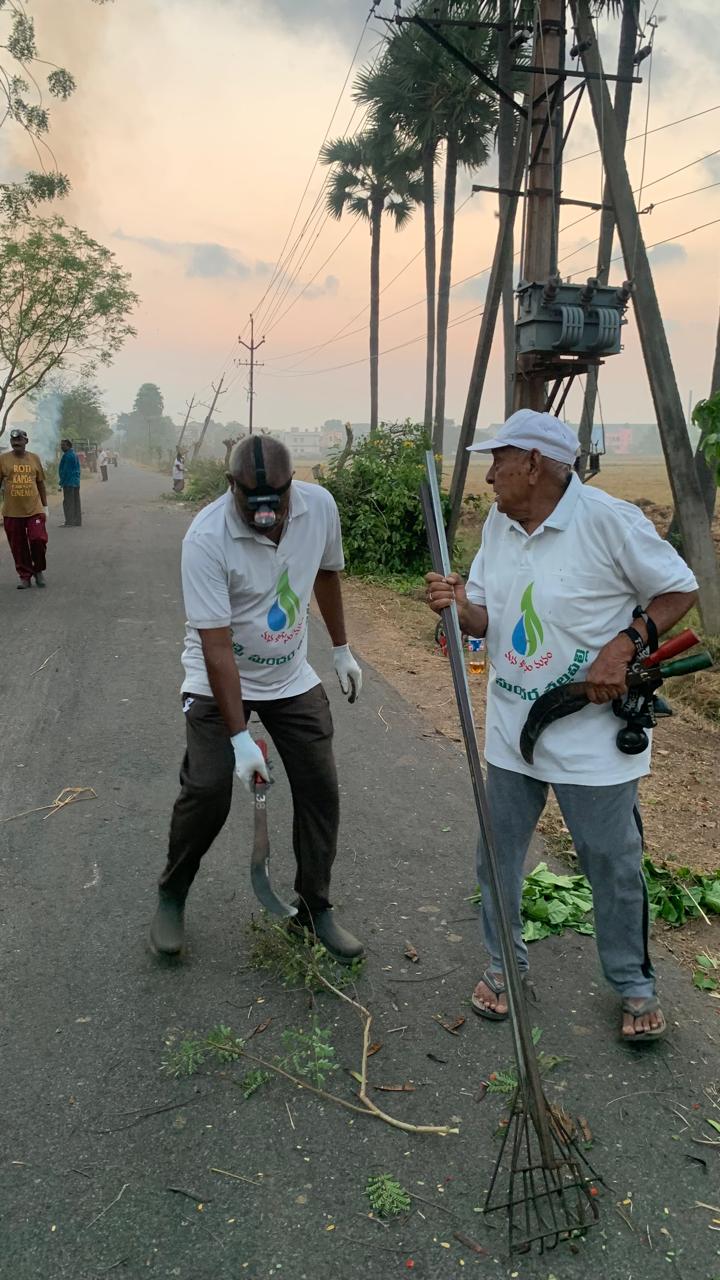 శ్రమదాతలీపూట ఆగినది NTR పాఠశాల ముఖ ద్వారం చప్టా వద్ద! కాని, పారిశుద్ధ్య పనులు జరిగింది మాత్రం అక్కడి నుండి చల్లపల్లి దిశగా 100 గజాల దాక! సాధ్యమైనంత వరకు కార్యకర్తల కరవాలములు బాట ఉత్తరపు చెట్ల జోలికి పోలేదు. 17-18 మందీ పాటుబడినది బాట ఉత్తరపు మార్జిన్లు మరియు మురుగు నీటి కాలువ అంచుల్లోని ఎందుకూ పనికిరాని కలుపుల - పిచ్చి మొక్కల పని బట్టడానికే!