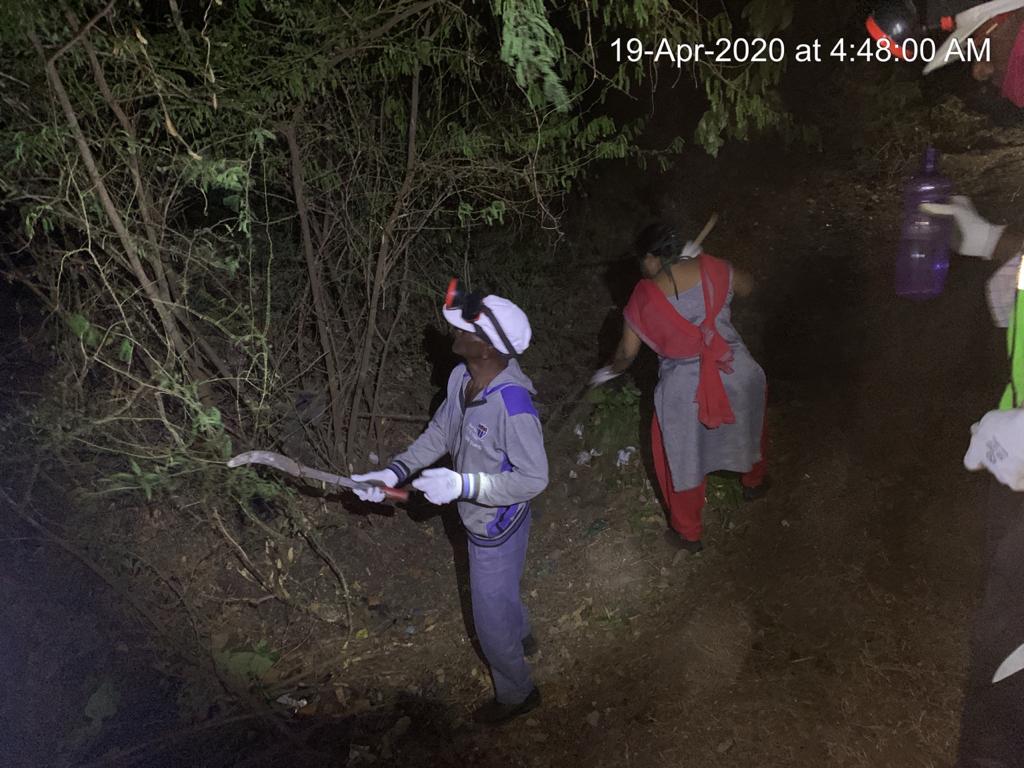 3) ఈ నాడు ఎక్కువ మంది కార్యకర్తలు తమ శ్రమ విరాళం సమర్పించింది మాత్రం నారాయణరావు నగర్ లోని ఒక ప్రముఖ వీధిలోనే! రెస్క్యూ టీం వారితో సహా 25 మందికి పైగా ఆ వీధికిరు వైపులా – పిచ్చి, నిరర్ధక మొక్కల్ని, ముళ్ళ కంపను, నరుకుతూ, ఊడుస్తూ, దంతెలతో పోగులు చేస్తూ – వాటిని ట్రాక్టర్ లో నింపి చెత్త కేంద్రానికి తరలిస్తూ – అవసరమైతే మురుగులో దిగి కూడ వ్యర్ధాలను తొలగిస్తూ – ఈ వేసవి ఉక్కపోతతో బట్టలు తడిసి నానుతూ.... 2 గంటల సమయాన్ని ఇట్టే పూర్తి చేసి మరీ కాఫీ సేవించి గృహోన్ముఖులయ్యారు.