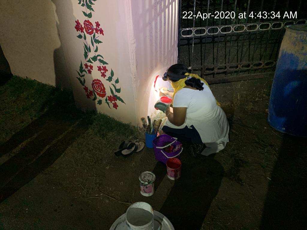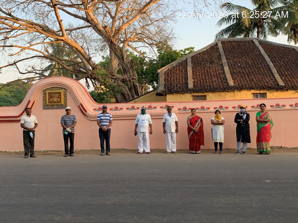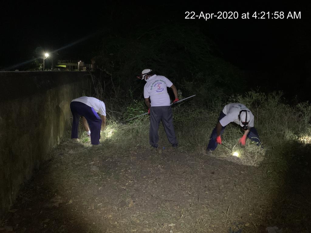 - 18 మంది కార్యకర్తలు వైజయంతం లోపలి సువిశాల భాగంలో ముళ్ళ – పిచ్చి చెట్లను నరికి, బండెడు ఎండుటాకుల్ని ఊడ్చి పోగు చేసి, ఆవరణ స్వరూపాన్ని మార్చి వేస్తున్నారు. అక్కడ ఎన్ని ఎండు కొమ్మలు, పనికిరాని రాలి పడిన కొమ్మలు, కాయలు, గడ్డి ఉన్నాయో అన్నీ వీళ్ళ కృషితో శుభ్రమైపోయి రూపు రేకలు మారుతున్నాయి!