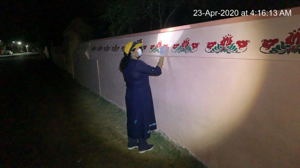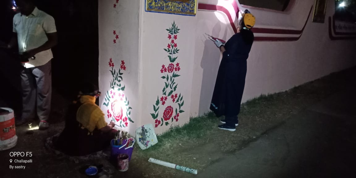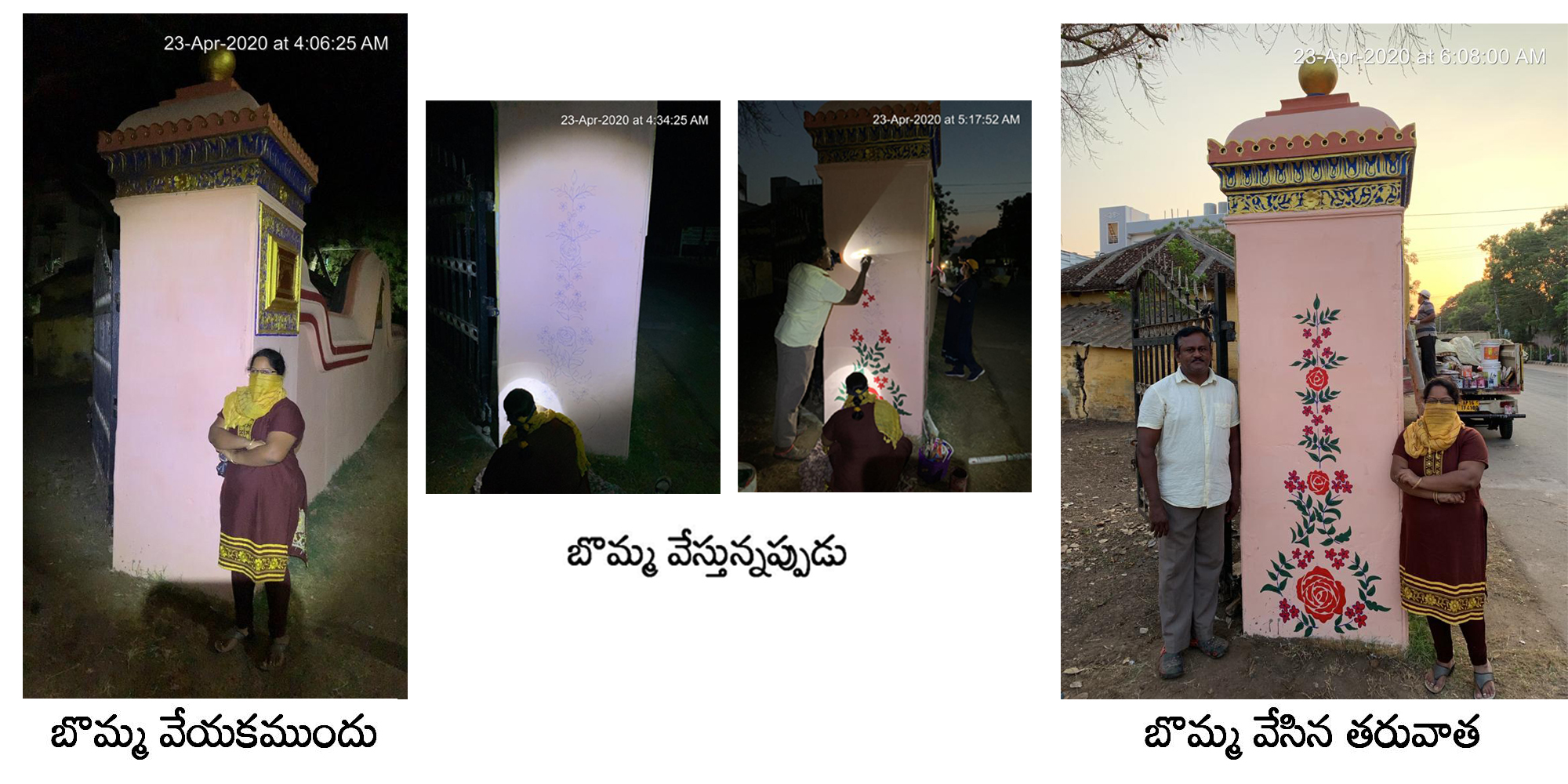 - సుందరీకరణ ముఠా సంఖ్య క్రమంగా పెరుగుతున్నట్లు గమనించాను. గోడకు క్రింది వరుసలో సాంప్రదాయక బొమ్మంచులు దిద్దుతూ కొందరు, ప్రవేశ ద్వారం దిమ్మెల మీద రంగురంగుల అందమైన పూల తీగలను ప్రాకిస్తూ కొందరు 2 ½ గంటల పాటు తమ గ్రామ రహదారి అందాలను శిఖర స్ధాయికి చేర్చే తపనలో గడపడం - పాతవాడిని గనుకనాకాశ్చర్యం కలిగించలేదు.