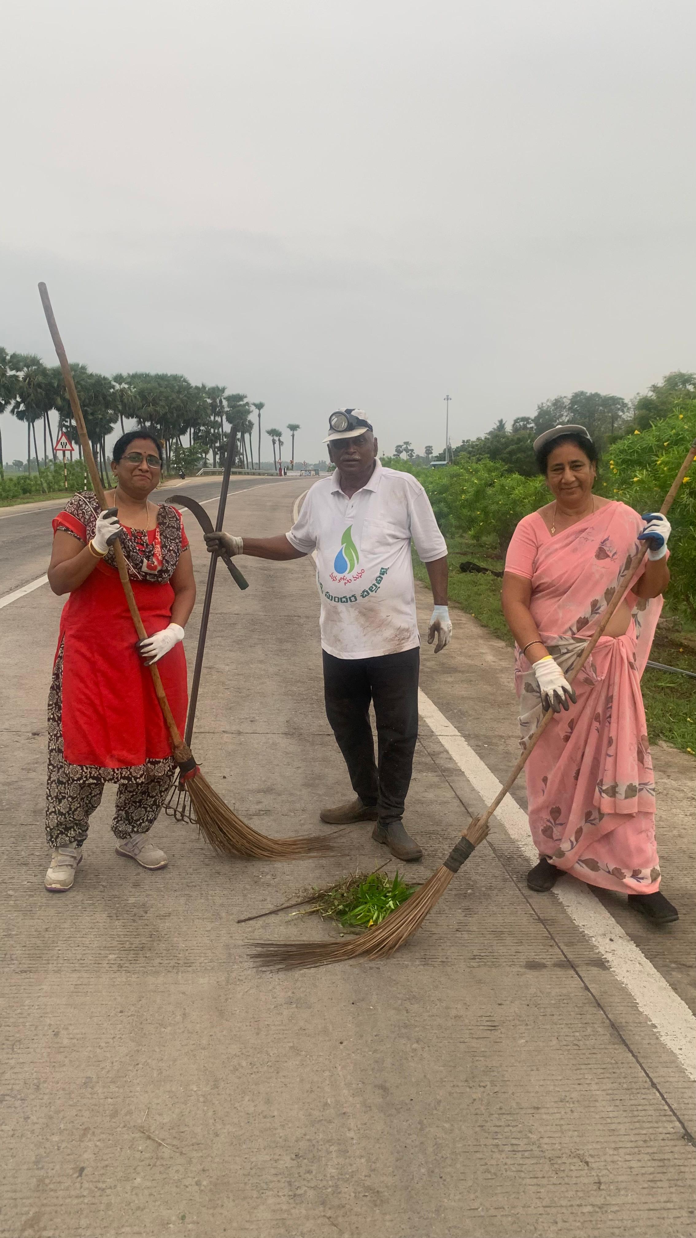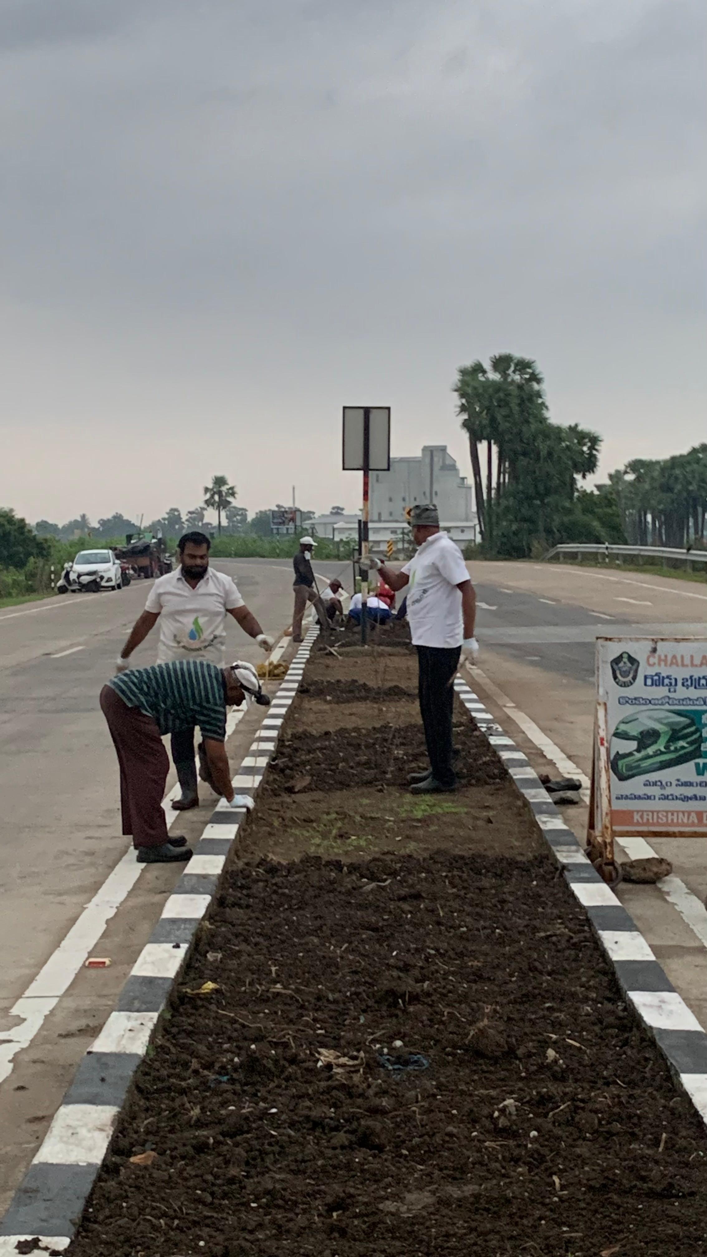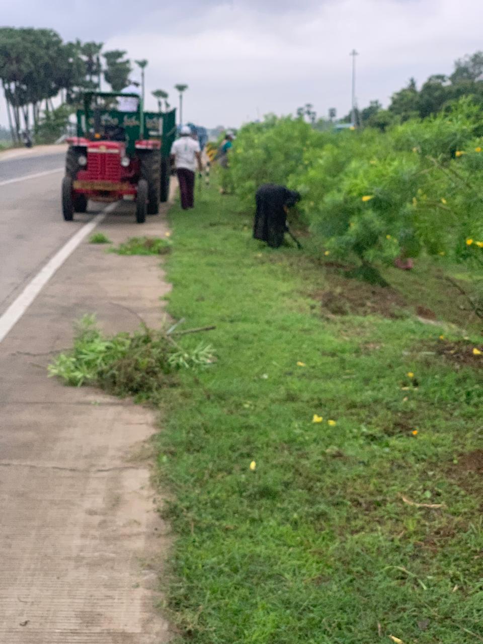 హైవేలో బందరు రోడ్ వైపుగా కుడి, ఎడమల ప్రక్కల ఏపుగా పెరిగిన గుడి గన్నేరు మొక్కలు పూలతో కనువిందు చేస్తున్నాయి. రహదారికి దిగువన మరియు అంచుల వద్ద పూల మొక్కల వద్ద కలుపును తీస్తూ, చెత్తను వేరు చేస్తూ, పోగులుగా పెట్టి, డిప్పలలో కెత్తి, ట్రాక్టర్ లో వేస్తూ కార్యకర్తల శ్రమ విన్యాసాలు చూడమచ్చట గొలుపుతున్నాయి.