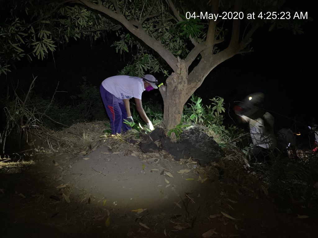 రెస్క్యూ దళం వారి తారు రోడ్డు, వృక్ష మూలాల పటిష్టతా కృషి ఈ నాడు కాస్త మందిగించింది. వారి నేటి పని ప్రాంతం మురుగు కాల్వలో నుండి నిట్ట నిలువుగా ఉండటమూ, అక్కడ దట్టంగా అల్లుకొన్న గుర్రపు డెక్క, బొత్తిగాచాలని వెలుతురూ అందుకు కారణాలు కావచ్చు. వీరిలోని ఒక ఆల్ రౌండర్ కార్యకర్త కాలికి ఒక పాము చుట్టుకోవడమూ, దాన్ని విదిలించుకోవడంతో కొంత పని సమయ నష్టం జరిగింది! (ఆ పామూ, కార్యకర్తలూ ప్రస్తుతం అంతా క్షేమం.) మరొక 5 చెట్ల కుదుళ్ళ రక్షణా కార్యక్రమం రేపటికి మిగిలేపోయింది!
