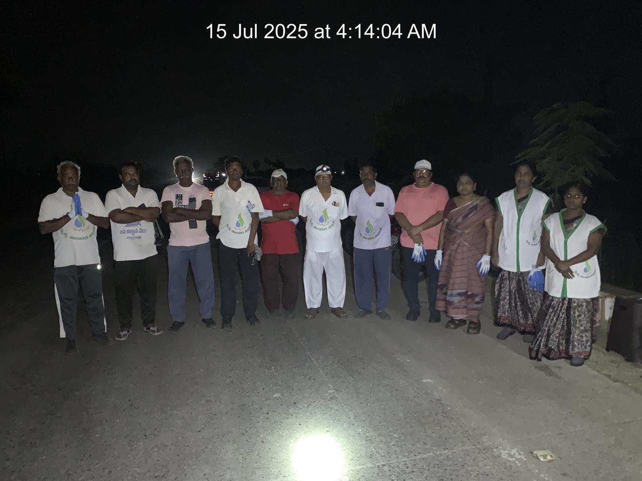 హైవే పై క్లబ్ రోడ్డుకు సమీపంలో 4:14 నిమిషాలకు 12 మంది కార్యకర్తలతో ఈరోజు పని మొదలైంది. క్రమక్రమంగా కార్యకర్తలు పెరుగుతూ రహదారికి పొడవునా మనం పెట్టిన మొక్కలలో వచ్చిన విపరీతమైన కలుపు, మొక్కలను చుట్టుముట్టి పెరుగుదలకు ఆటంకమైన పిచ్చి దొండ తీగ మొదలగు వాటిని లాగివేసి మొక్కలకు 5 అడుగుల దూరం వరకు క్రింది భాగంలో కార్యకర్తలు శుభ్రం చేసుకుంటూ ముందుకు సాగారు.