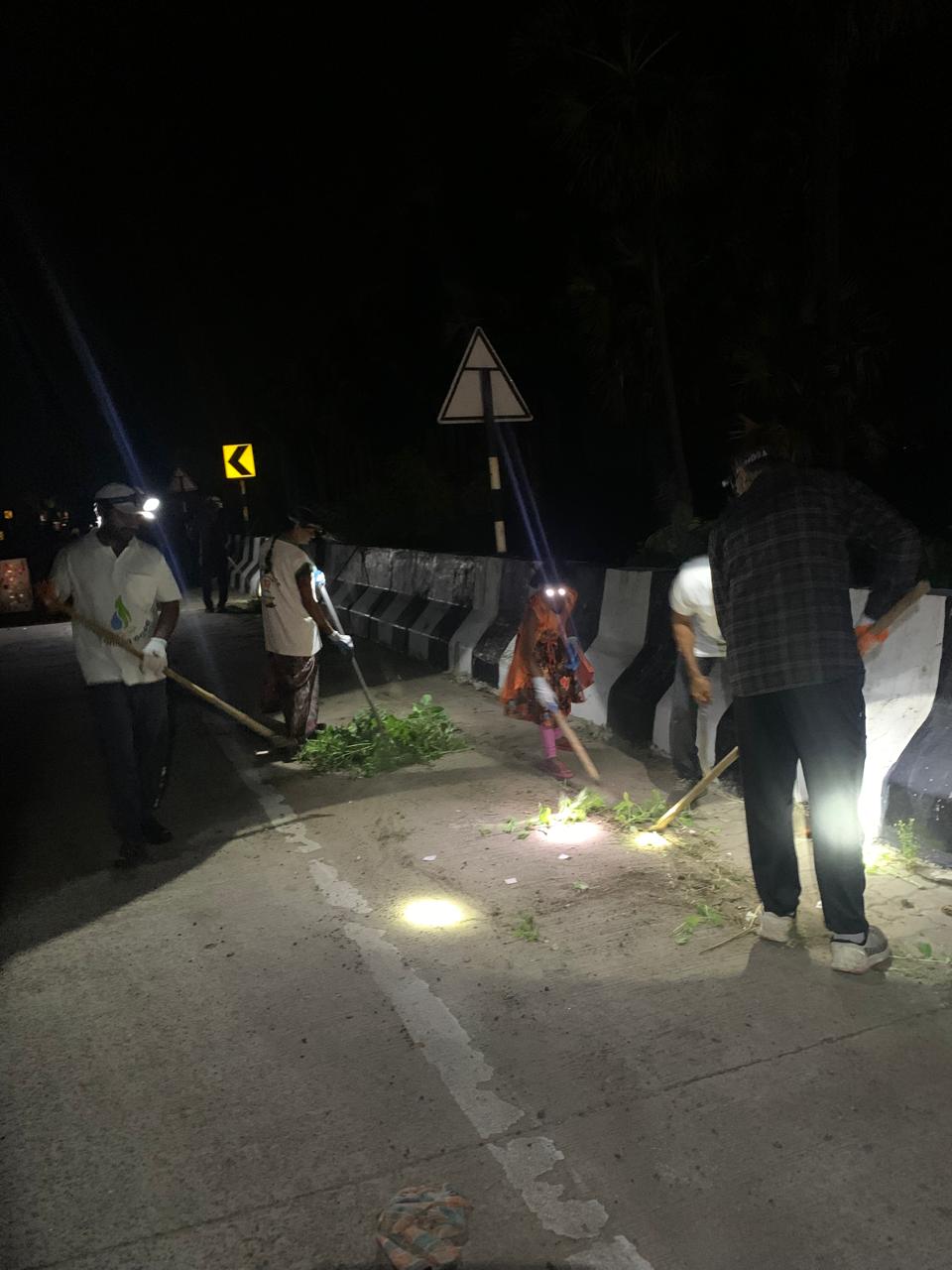 జాతీయ రహదారికి ఒక అంచున ఉన్న రిటైనింగ్ వాల్ పొడవునా పేవర్స్ రాళ్ళ మధ్యలో మొలిచిన గడ్డి మొక్కలను లాగుతూ రాళ్లపై పేరుకుపోయిన మట్టిని గోకుడు పారలతో శుభ్రం చేసి ఊడవడం ఈ రోజు అందరి పనిగా జరిగింది.