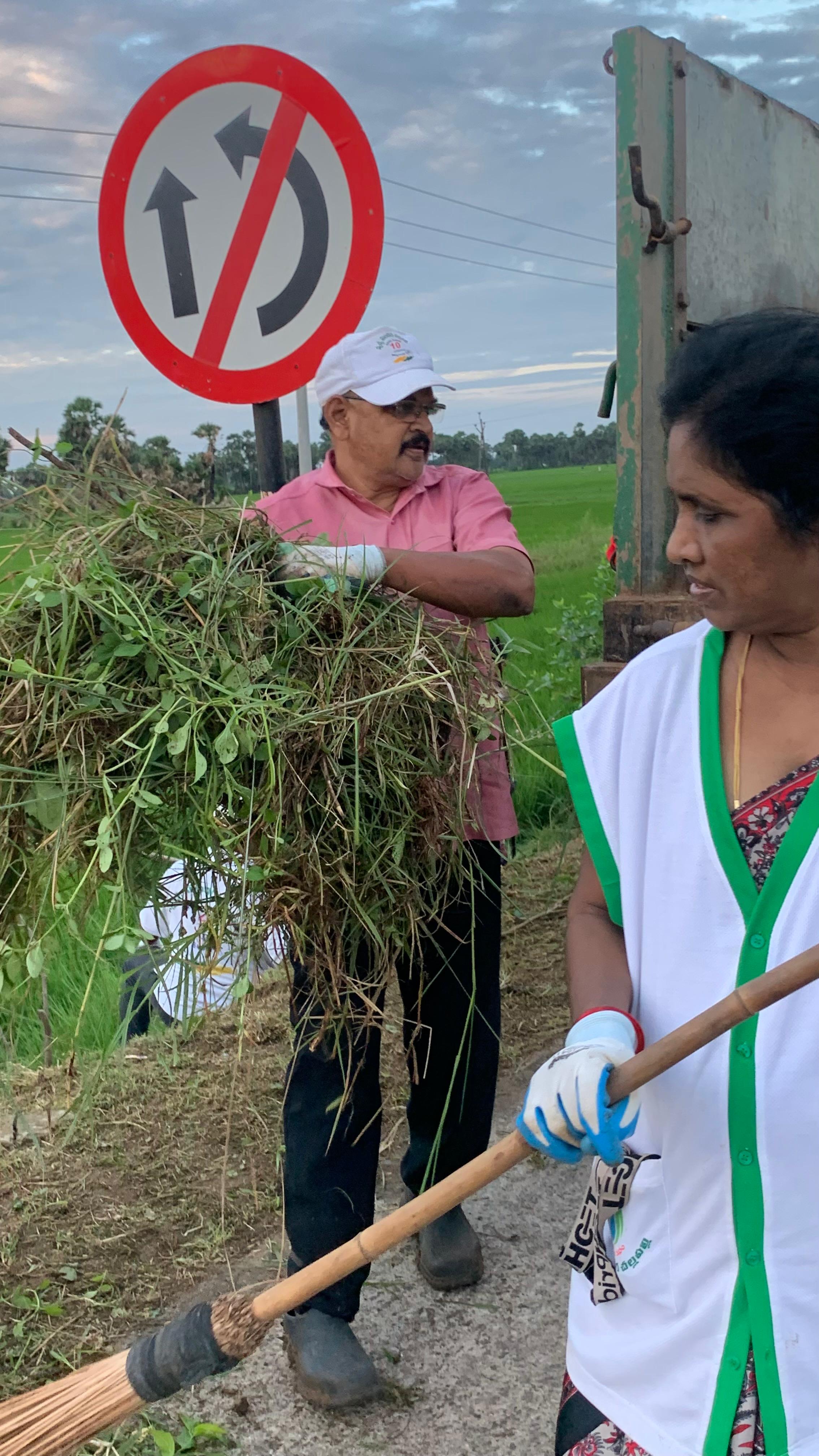 రోడ్డుకు దిగువ భాగాన చేతులతో, కత్తులతో, పంజాలతో గతంలో నాటిన మొక్కల చూట్టూ చిత్తుచిత్తుగా పెరిగిన పిచ్చి గడ్డిని, కలుపును పీకి గుట్టలుగా పోగేసారు.