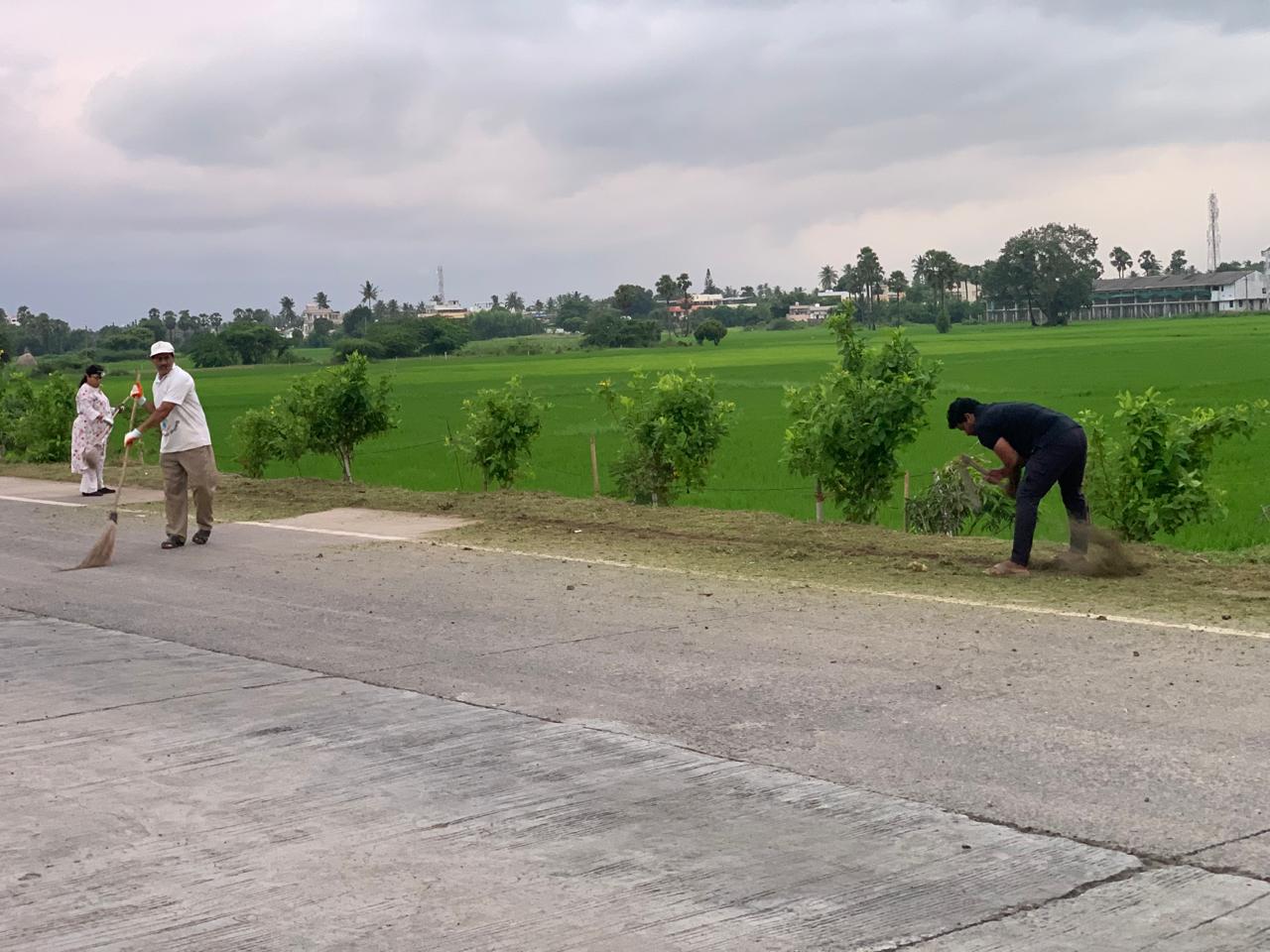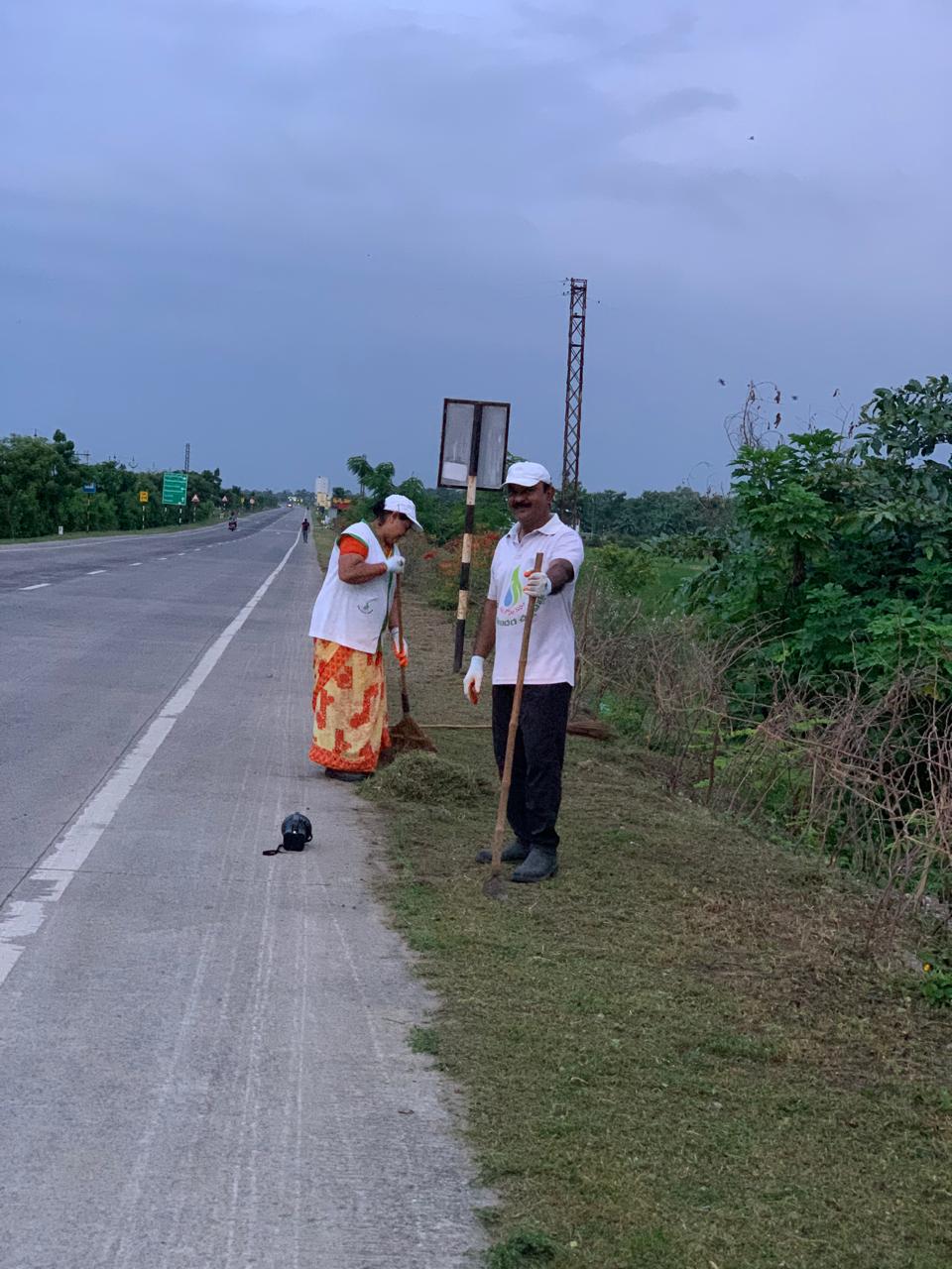 ఒక కార్యకర్త మిషన్ చేతబట్టి విసుగూ విరామం లేకుండా దారి పొడవునా మార్జిన్ గడ్డిని కత్తిరిస్తూ హైవే కు అందాలనద్దుతున్నారు. కట్ చేసినప్పుడు రోడ్డు మీద పడిన గడ్డి పొడిని మహిళా కార్యకర్తలు పరిశుభ్రం చేస్తున్నారు.